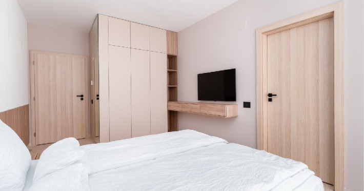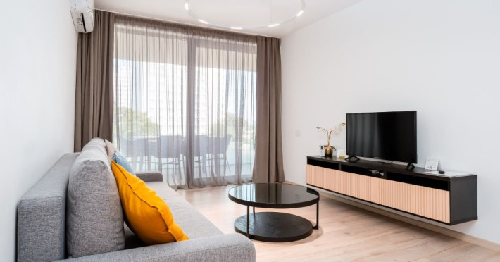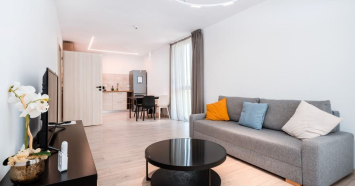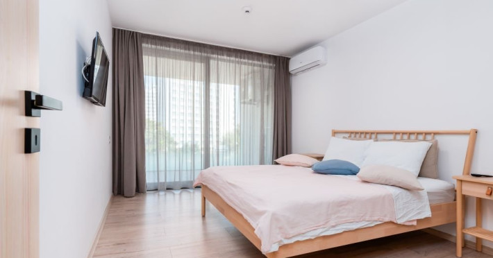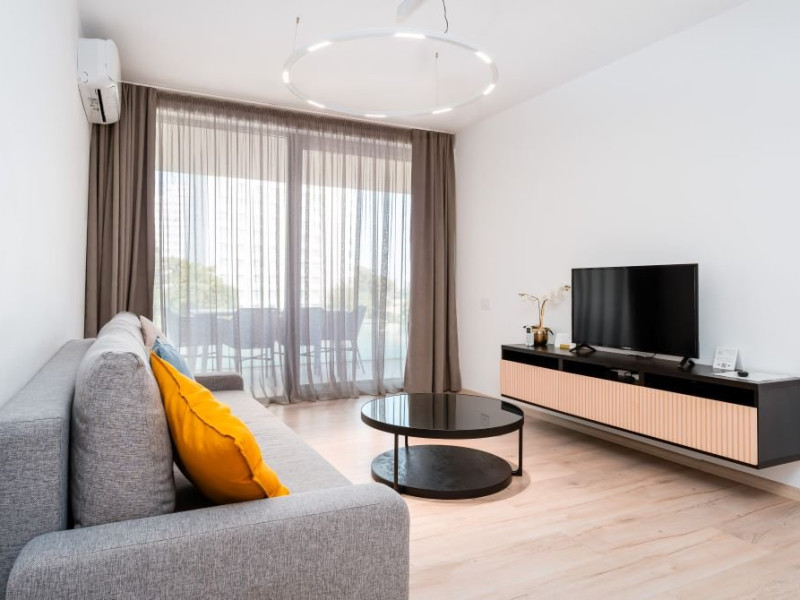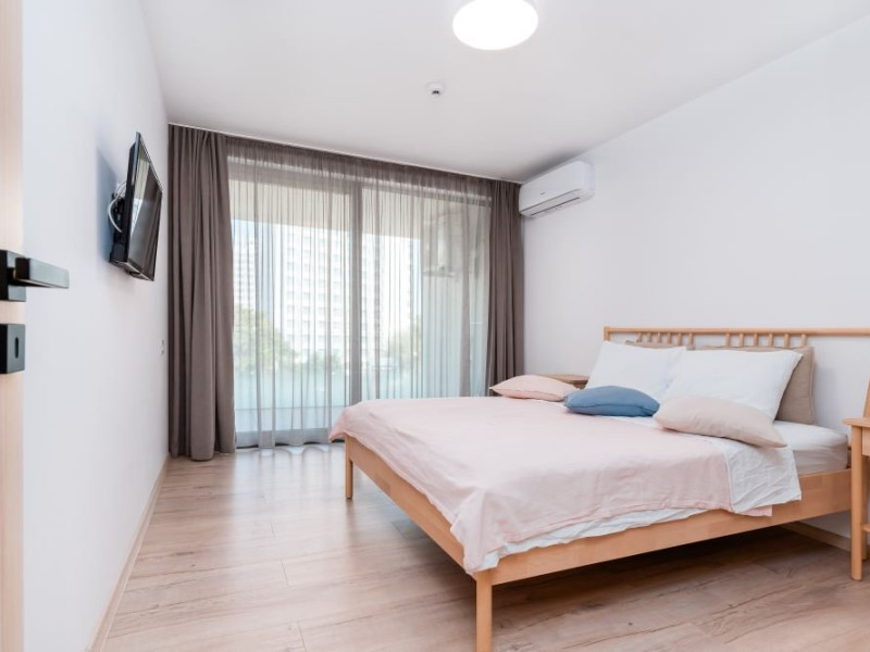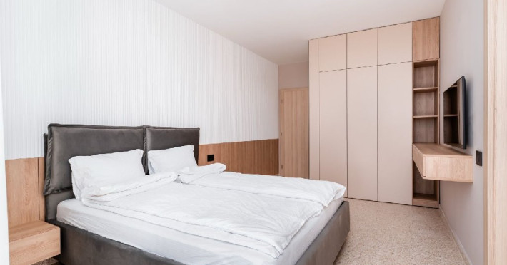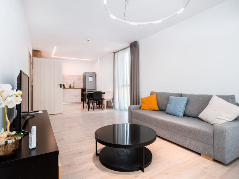 Apartament cu 2 camere: este format din living cu canapea extensibila, bucatarie utilata, dormitor cu pat matrimonial, baie cu dus, balcon/terasa (repartizarea se face la receptie). Are 1 loc de parcare asigurat. Suprafata: 53-55 mp.