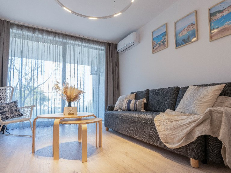 Este format din living cu canapea extensibila, bucatarie utilata, dormitor cu pat matrimonial, baie cu dus, balcon/terasa cu mobilier.