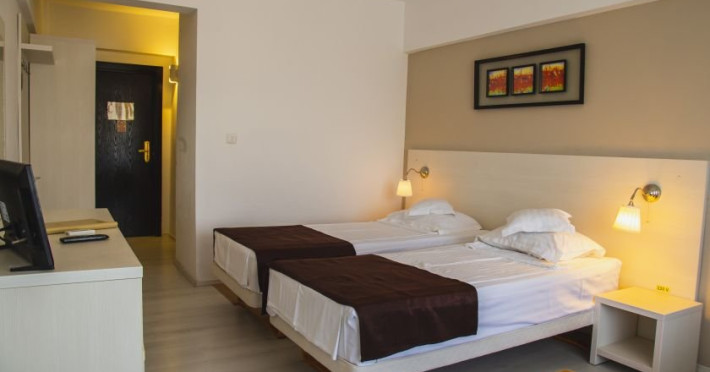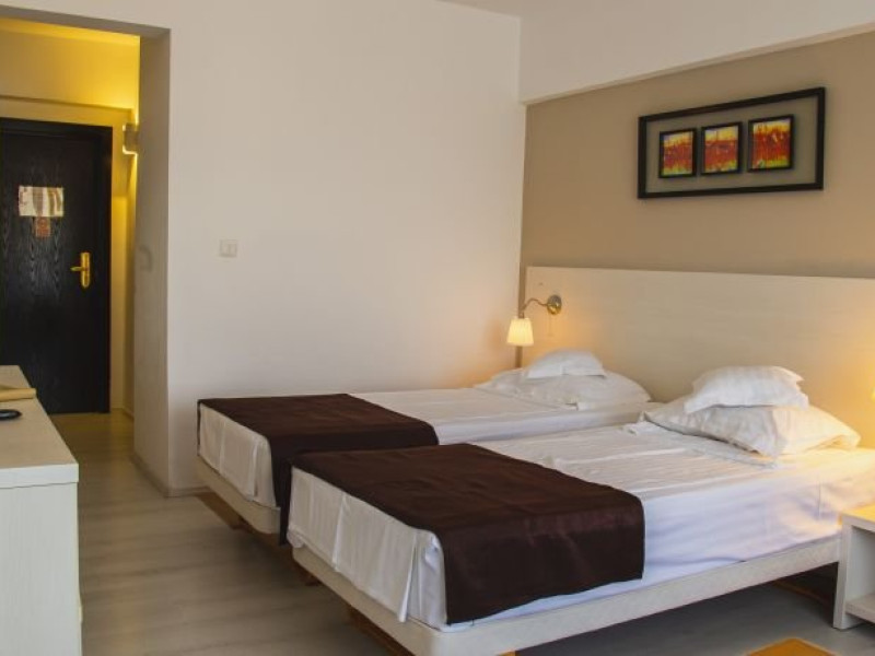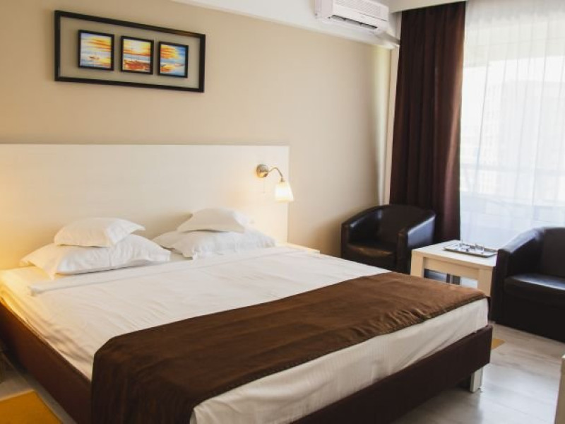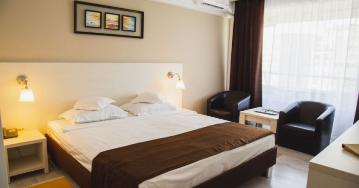 Amplasat in nordul statiunii Mamaia, intr-o zona linistita la numai 50 m de plaja, Hotel Ambasador Mamaia ofera tuturor oaspetilor posibilitatea de a petrecere o vacanta relaxanta la malul marii Negre. Serviciile de calitate, experienta indelungata si atentia personalului nostru contureaza minunat vacanta dumneavoastra de vis, fie ca alegeti un sejur all inclusive sau doar unul cu mic dejun! Descriere camere: Dubla lake view/twin lake view: Este o camera de 24 matri patrati cu un pat King Size, cu vedere la lac. Dubla sea view/Dubla twin sea view: O camera de 24 metri patrati cu pat King Size si cu vedere spre mare. Dubla superioara cu vedere la lac: O camera de 24 metri patrati cu pat King Size si cu vedere spre mare. Dubla superioara cu vedere la mare: Este o camera de 30 metri patrati care contine un pat Queen Size si o canapea extensibila, care va ofera o vedere de ansamblu catre mare. Juniorsuite: O camera spatioasa de 40 metri patrati cu o zona pentru dormit cu un pat King Size si o zona de living cu o canapea extensibila in care pot dormi doua persoane. Toate camerele Junior Suite au balcon cu vedere la mare.. Suita superioara: Senior Suite este compus din dormitor cu pat King Size, un living spatios prevazut cu un coltar extensibil, o baie principala cu cada si chiuveta, un WC de serviciu, un balcon si o terasa cu vedere frontala la mare, 46 mp. Facilitati hotel: Parcare gratuita, acces wifi gratuit, RecepÅ£ie 24 de ore, Restaurant, Bar, Mic dejun, CamerÄ de bagaje, Fumatul interzis în toate spaÅ£iile publice Åi private, Camere nefumÄtori, Camere pentru Familii, Seif, Lift, TerasÄ, GrÄdinÄ, Plaja Privata.Datorita dinamicitatii domeniului disponibilitatea ofertelor se modifica de la un moment la altul. De aceea ofertele sunt valabile in limita locurilor disponibile. Agentia nu este responsabila pentru eventualele neconcordante care pot aparea intre informatiile privind tarifele si alte detalii din site si informatiile primite in agentie. In aceste cazuri vor avea prioritate, intotdeauna, informatiile primite in agentie.