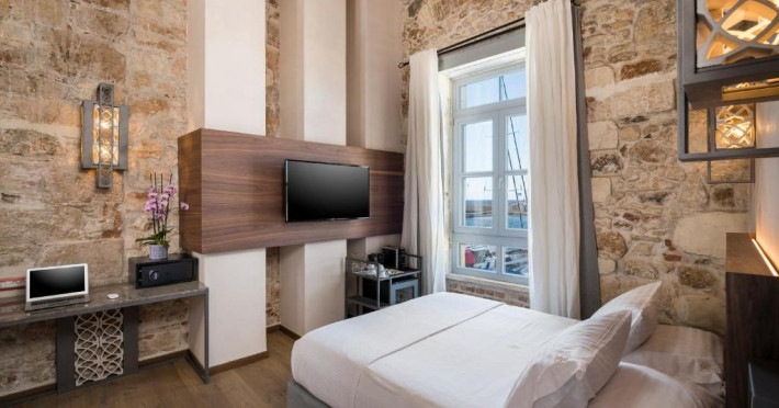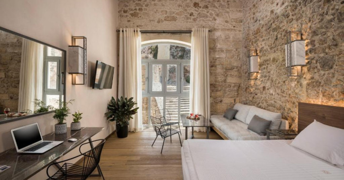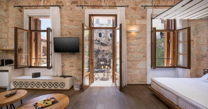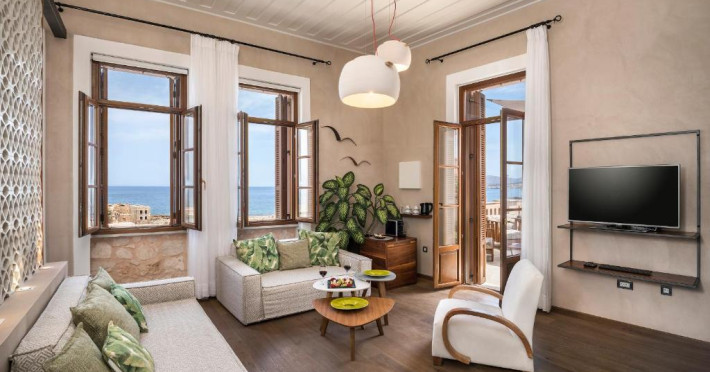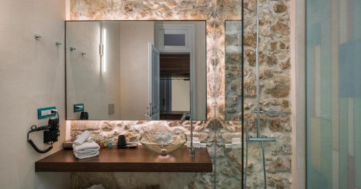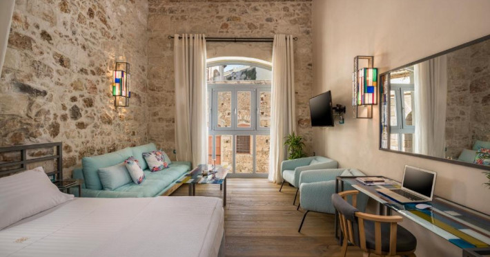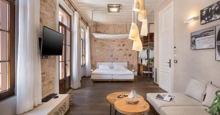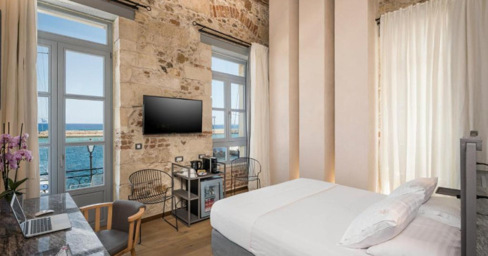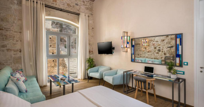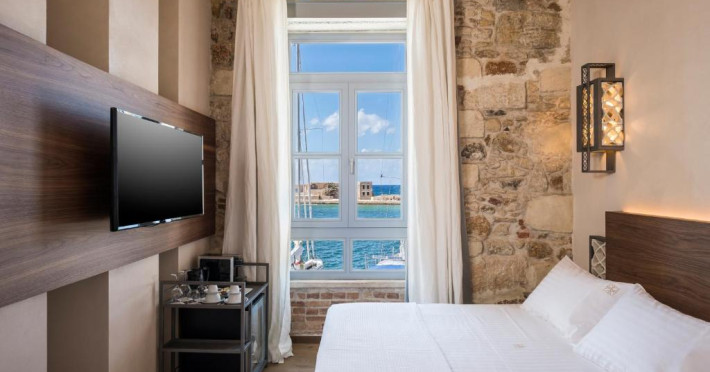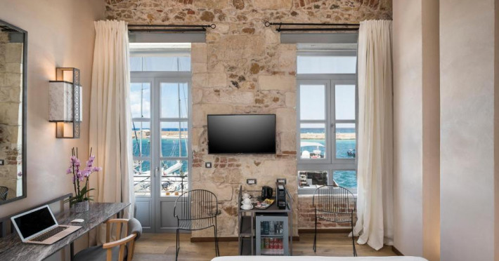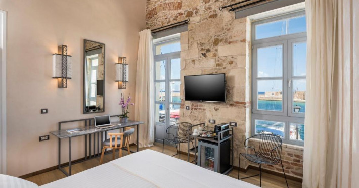 Toate camerele suitele de la Ambassadors au accesorii elegante și detalii din piatră, aer și zonă de relaxare cu TV cu ecran plat cu canale prin satelit și minibar. Majoritatea unităților au vedere la Marea Cretei și la vechiul port, iar unele au cadă spa și terasă sau balcon. In baie proprie există halate de baie, papuci și articole de toaletă.