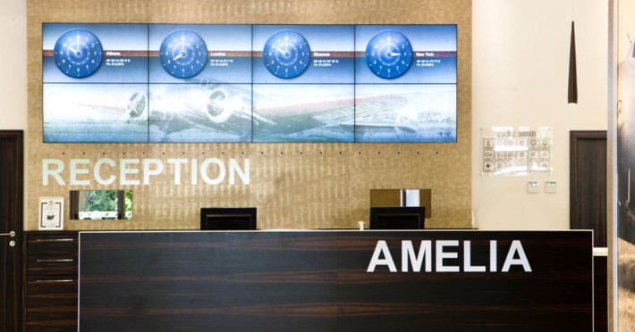 Sunt disponibile 40 camere. Unele camere au balcon cu vedere la mare, unde oaspeții pot admira apusul sau răsăritul soarelui. Camerele de la Amelia sunt dotate cu aer condiționat, Tv cu canale prin satelit și seif. Un minibar și o mașină pentru preparare cafea sau ceai se află în fiecare cameră. Oaspeții pot solicita serviciul de room service pentru a servi masa sau diverse băuturi. În camere există baie cu cadă sau duș ce are în dotare foehn și articole de toaletă gratuite. Oaspeții au acces gratuit la serviciul Wi-fi în camere. Curățenia in cameră se face zilnic. Proprietatea oferă camere pentru nefumători.
