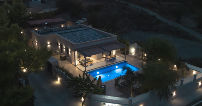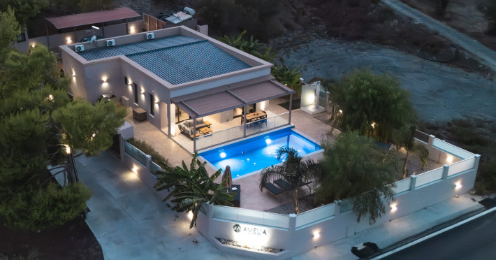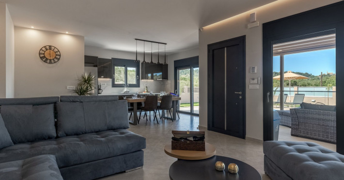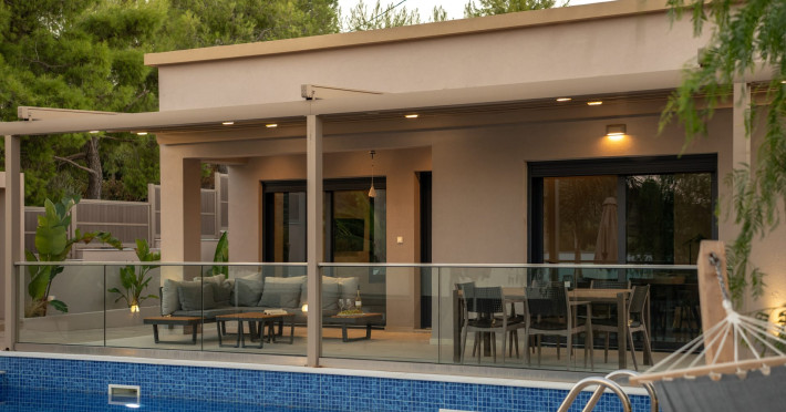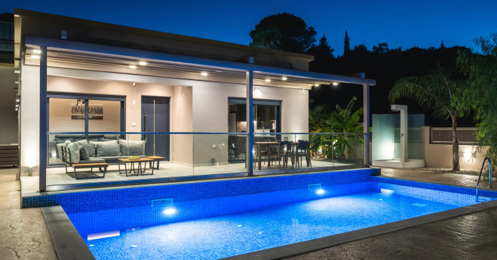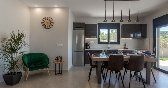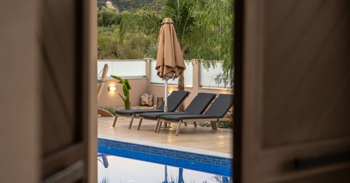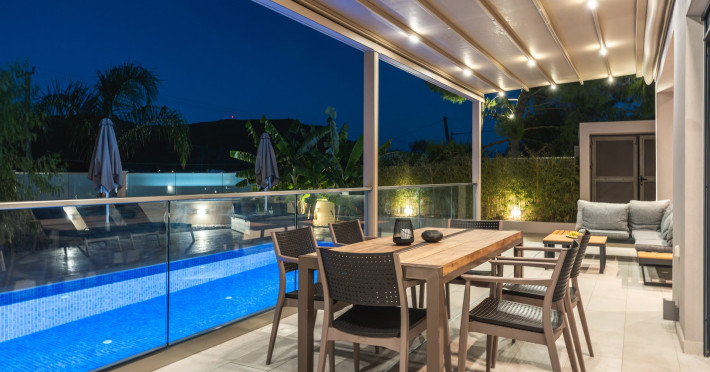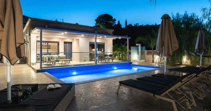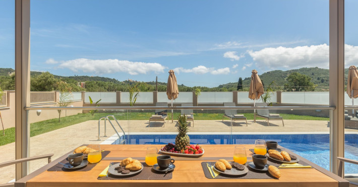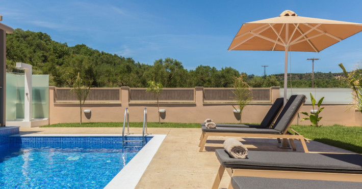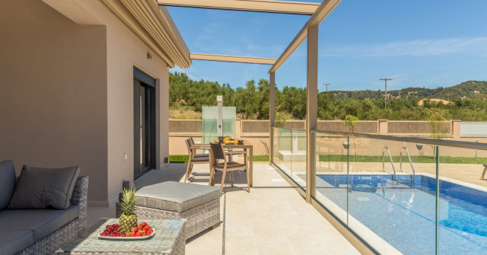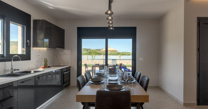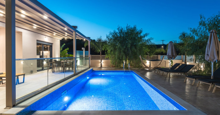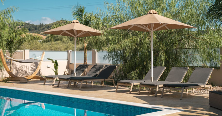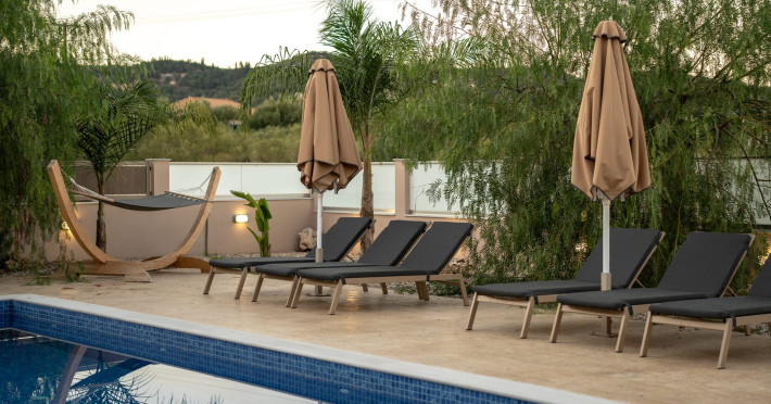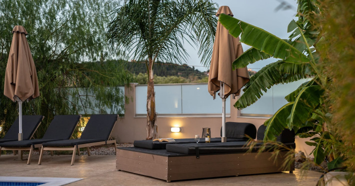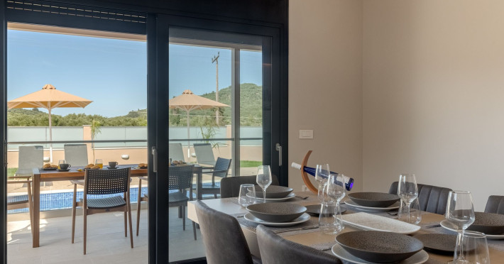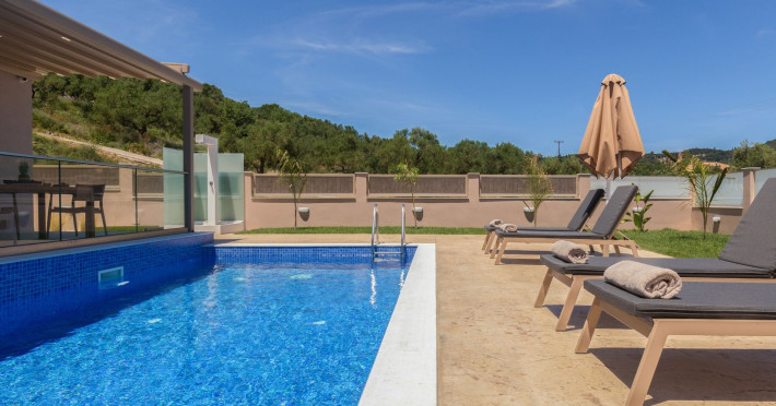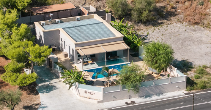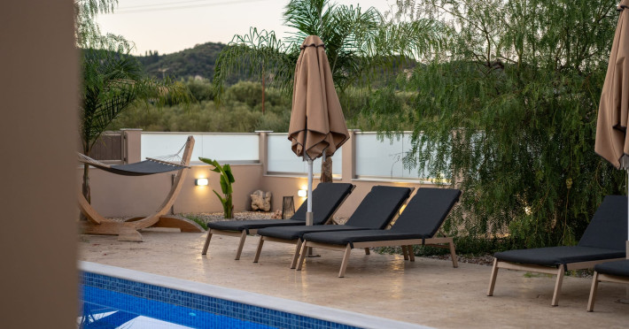 The luxurious, newly constructed holiday residence with pool, Amelia Residence, is built in a beautiful, leafy location in the village of Kato Gerakari, just 10 km from the city of Zakynthos. It offers its guests ideal moments of relaxation and tranquility in the verdant nature while combining all the comforts of a state-of-the-art residence.The spacious rooms and the idyllic environment offer a unique experience for families or groups of up to 9 guests who want to relax and combine luxury with the incomparable beauty of the landscape of Zakynthos.Rejuvenation, wellness, and relaxation by the pool and moments with family or friends at the privately-owned barbeque are combined in a unique environment that offers all the comforts and anticipates all the needs of its visitors!The luxurious, newly constructed holiday residence with pool, Amelia Residence, is built in a beautiful, leafy location in the village of Kato Gerakari, just 10 km from the city of Zakynthos. It offers its guests ideal moments of relaxation and tranquility in the verdant nature while combining all the comforts of a state-of-the-art residence.The spacious rooms and the idyllic environment offer a unique experience for families or groups of up to 9 guests who want to relax and combine luxury with the incomparable beauty of the landscape of Zakynthos.Rejuvenation, wellness, and relaxation by the pool and moments with family or friends at the privately-owned barbeque are combined in a unique environment that offers all the comforts and anticipates all the needs of its visitors!