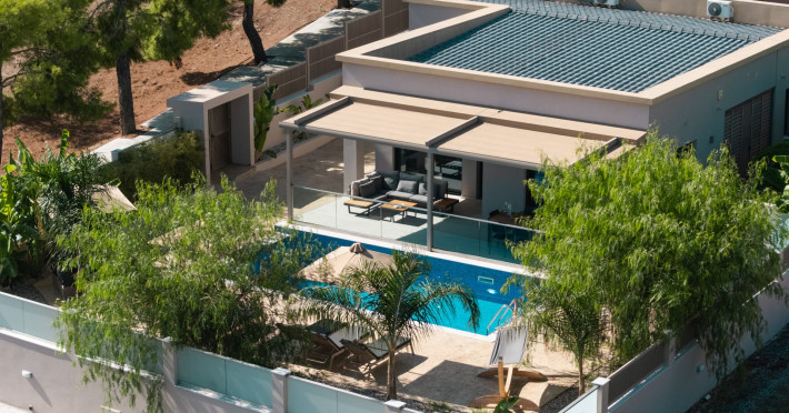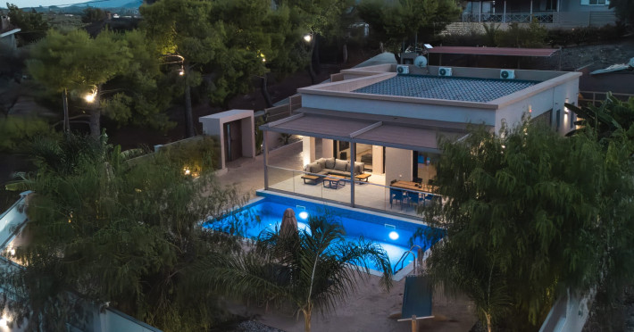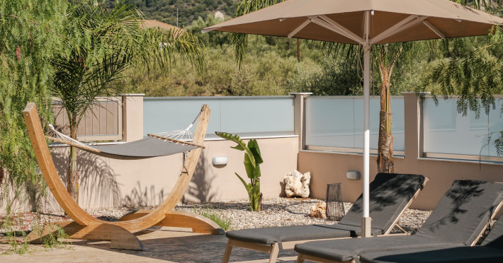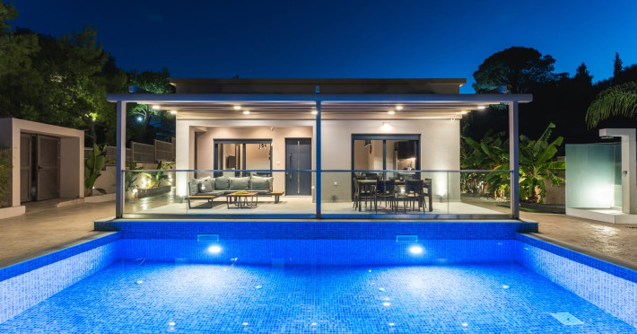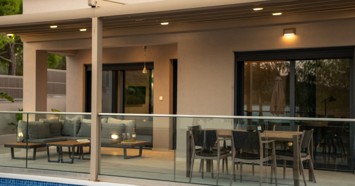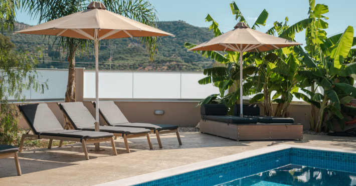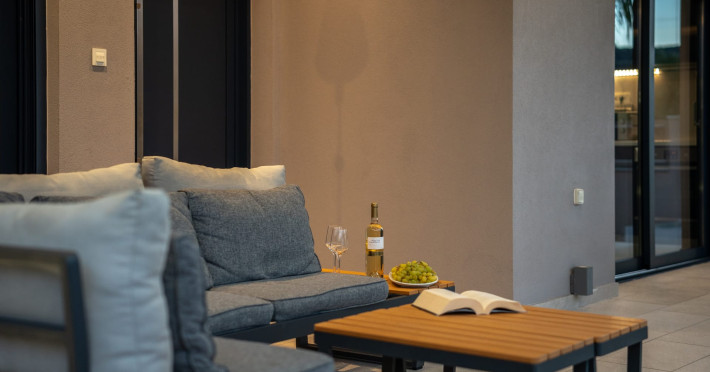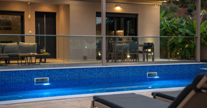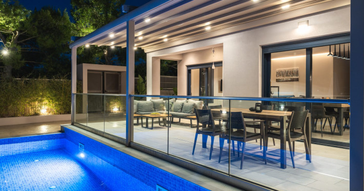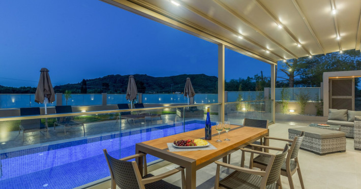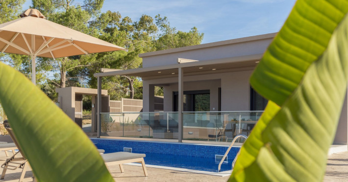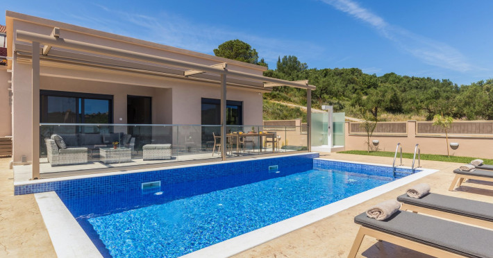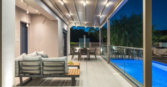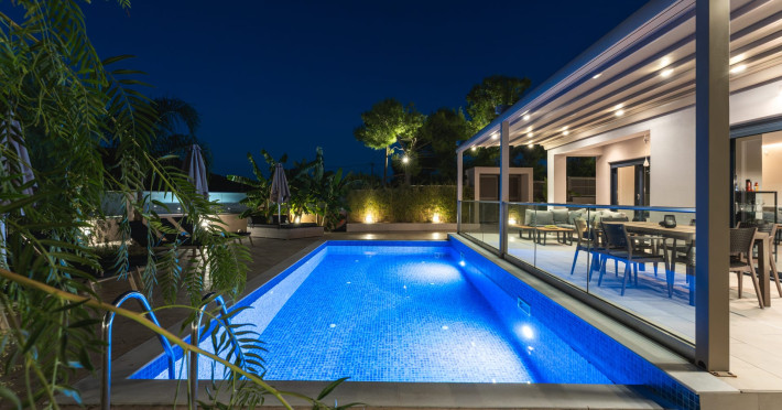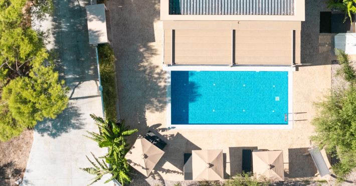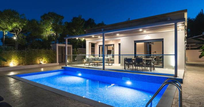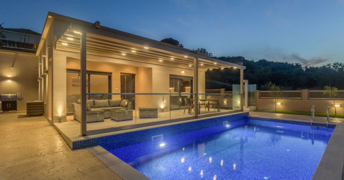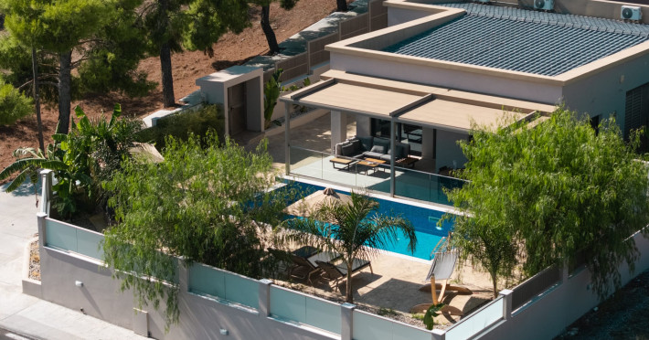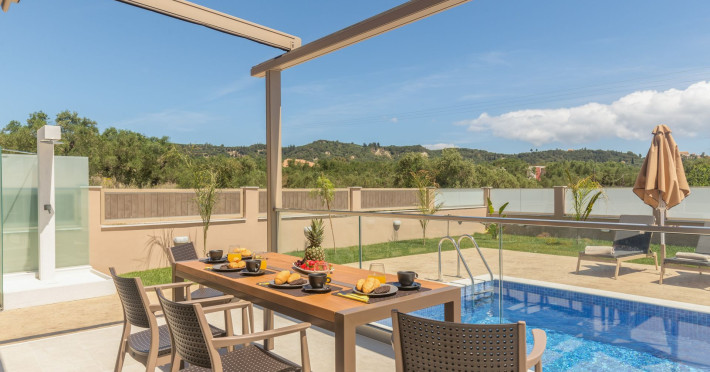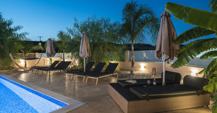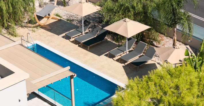 The luxurious, newly constructed holiday residence with pool, Amelia Residence, is built in a beautiful, leafy location in the village of Kato Gerakari, just 10 km from the city of Zakynthos. It offers its guests ideal moments of relaxation and tranquility in the verdant nature while combining all the comforts of a state-of-the-art residence.The spacious rooms and the idyllic environment offer a unique experience for families or groups of up to 9 guests who want to relax and combine luxury with the incomparable beauty of the landscape of Zakynthos.Rejuvenation, wellness, and relaxation by the pool and moments with family or friends at the privately-owned barbeque are combined in a unique environment that offers all the comforts and anticipates all the needs of its visitors!The luxurious, newly constructed holiday residence with pool, Amelia Residence, is built in a beautiful, leafy location in the village of Kato Gerakari, just 10 km from the city of Zakynthos. It offers its guests ideal moments of relaxation and tranquility in the verdant nature while combining all the comforts of a state-of-the-art residence.The spacious rooms and the idyllic environment offer a unique experience for families or groups of up to 9 guests who want to relax and combine luxury with the incomparable beauty of the landscape of Zakynthos.Rejuvenation, wellness, and relaxation by the pool and moments with family or friends at the privately-owned barbeque are combined in a unique environment that offers all the comforts and anticipates all the needs of its visitors!