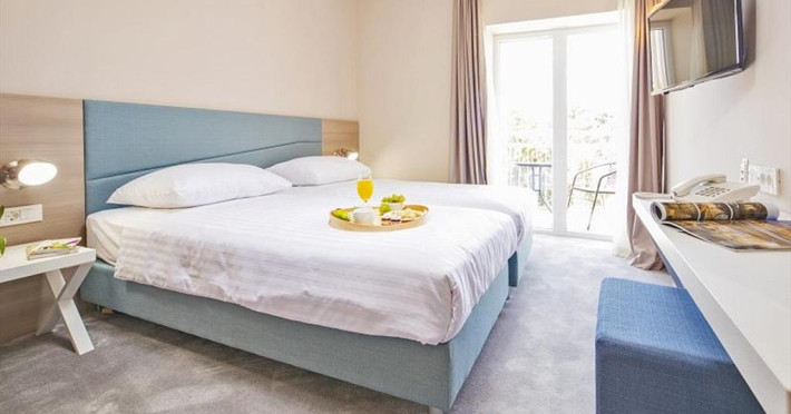 Hotelul Aminess Port 9 a fost complet renovat în anul 2017 și are vedere la golf. Hotelul pune la dispoziție o piscină în aer liber cu terasă la soare, centru de wellness și fitness și 9 restaurante. Oaspeții beneficiază de WiFi gratuit în toate zonele. Oaspeții pot profita de serviciile oferite în complex, printre care și restaurantele care servesc preparate locale și internaționale, barul din hol și piscina. Accesul la zona de wellness, cu saună, cadă spa și masaje, precum și accesul la centrul de fitness presupun costuri suplimentare.