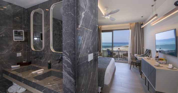 Camera dispune de baia privata luxoasa dotata cu chiuvete duble, WC separat si dus, exista un uscator de par profesional, oglinda de marire iluminata, cantar, produse de ingrijire a parului si corpului de marca, halate de baie si papuci, precum si prosoape pentru piscina si plaja.