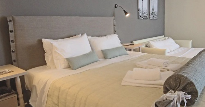 Camerele de la Amphitryon sunt decorate modern în tonuri de gri, alb şi accente de negru, cu vedere la piscină sau la împrejurimi. Aceste camere sunt dotate cu: aer condiționat, frigider, TV cu ecran plat (canale prin satelit), baie privată cu cabină de duș, uscător de păr și articole de toaletă gratuite, birou, izolare fonică, balcon/ terasă, pardoseală de gresie/ marmură, unele camere au și canapea extensibilă.