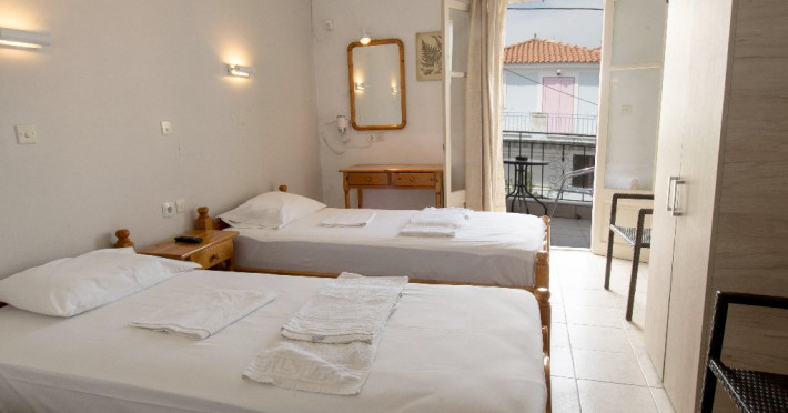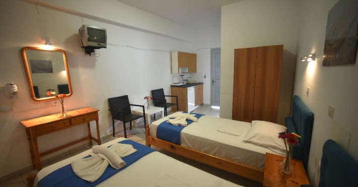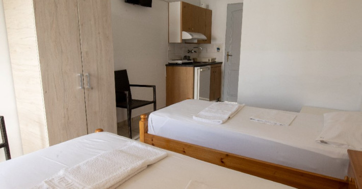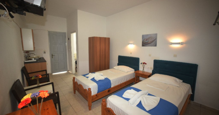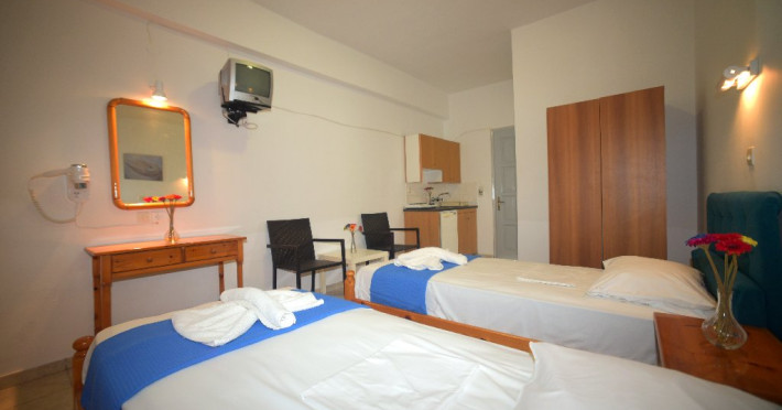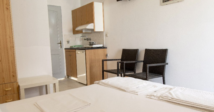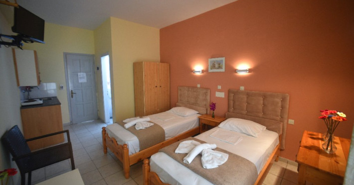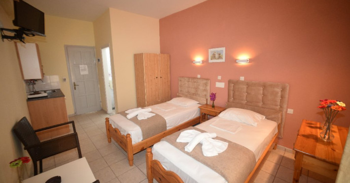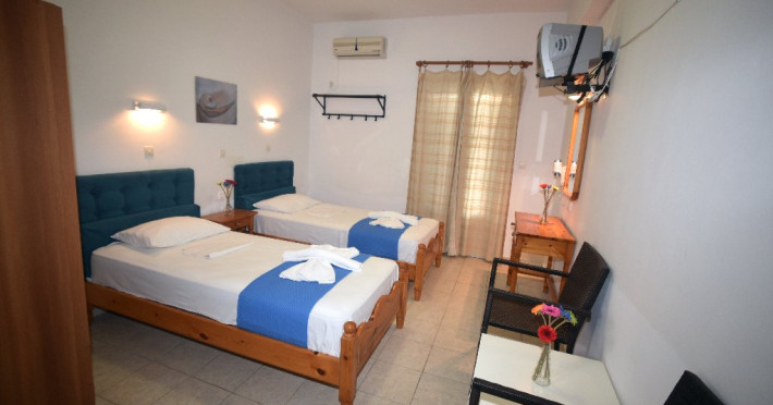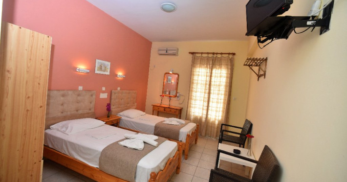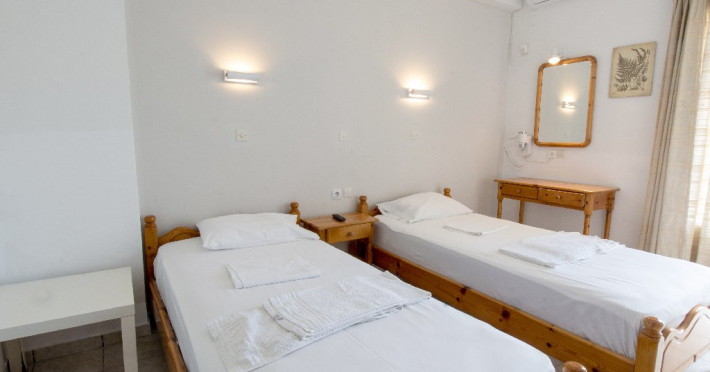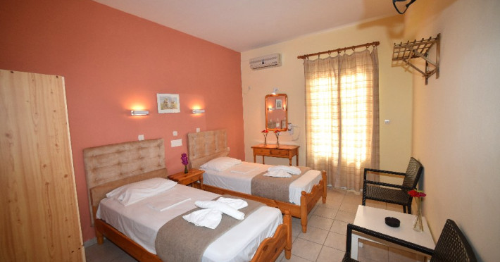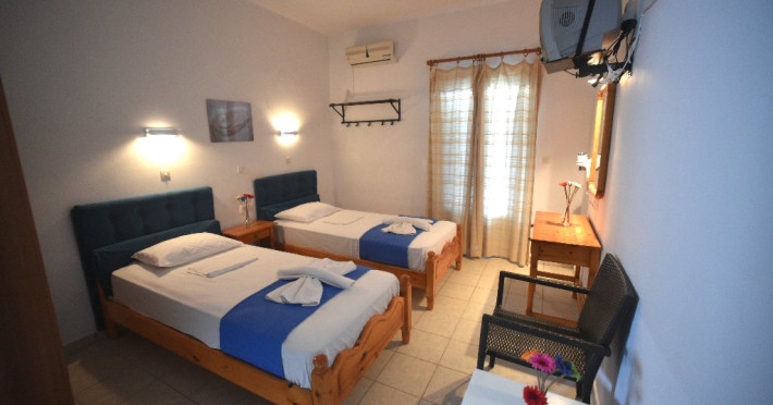 Camerele sunt bine intretinute, echipate cu facilitati esentiale, printre care WIFI, climatizare, TV, chicineta complet echipata, frigider si balcon sau terasa care ofera vederi incantatoare spre mare, gradina sau peisajele rurale ale insulei.