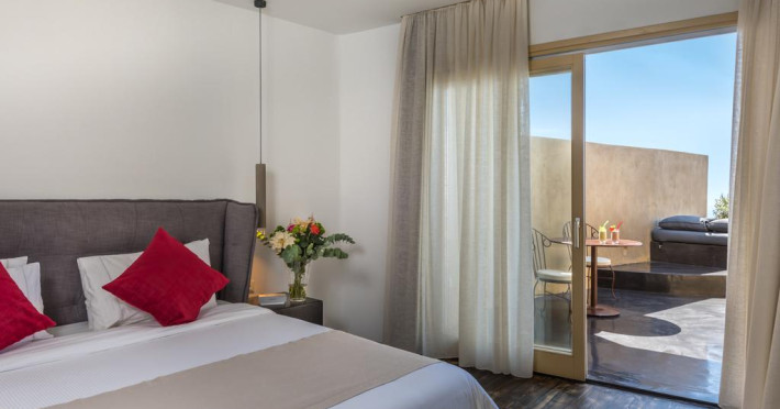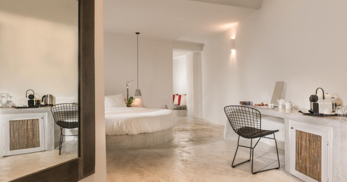 Sunt disponibile 28 camere. În camere există baie cu cadă sau duș prevăzută cu foehn. Oaspeții au la dispoziție serviciul de room service pentru a servi masa sau diverse băuturi. Camerele luminoase de la Andronis Concept Wellness Resort sunt dotate cu aer condiționat și Tv cu canale prin satelit. Oaspeții au acces gratuit la serviciul Wi-fi în camere. Curățenia in cameră se face zilnic. Proprietatea oferă camere pentru familie cu o suprafață mai mare și un număr mai mare de paturi față de cele standard. Se pot rezerva de asemenea camere pentru nefumători.