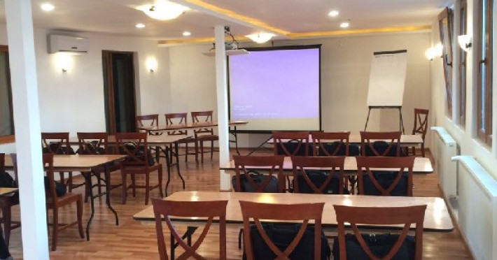 Echipamentul standard: 1 ecran de proiectie; 1 videoproiector (mufa hdmi la pupitru), 1 flipchart, markere si hartii flipchart; internet wi-fi. La cerere, putem oferi meniu catering si coffee-break.