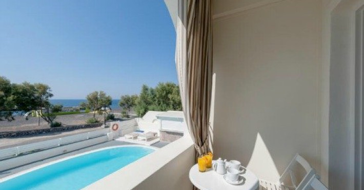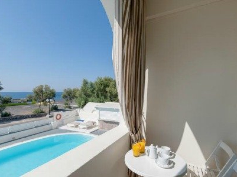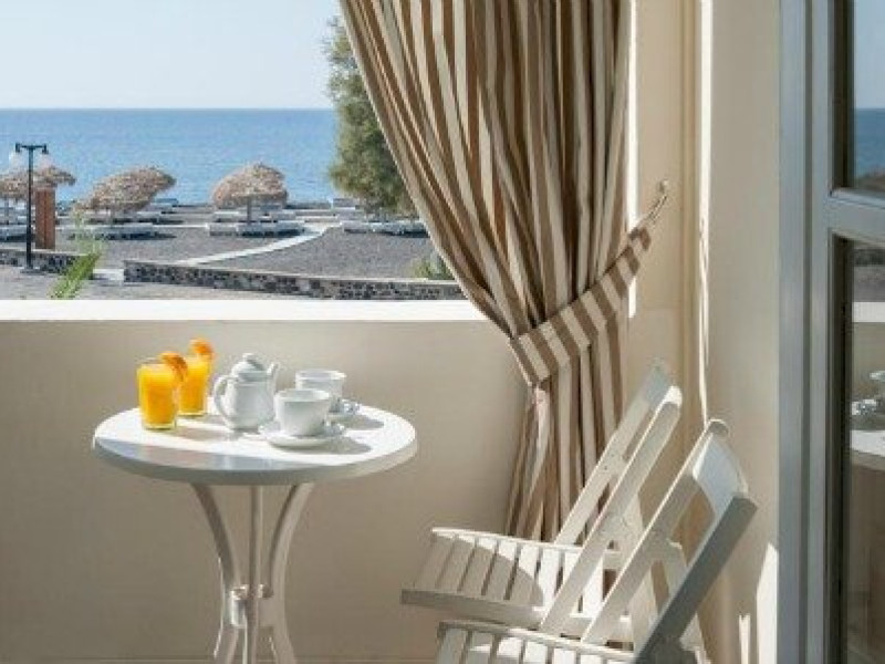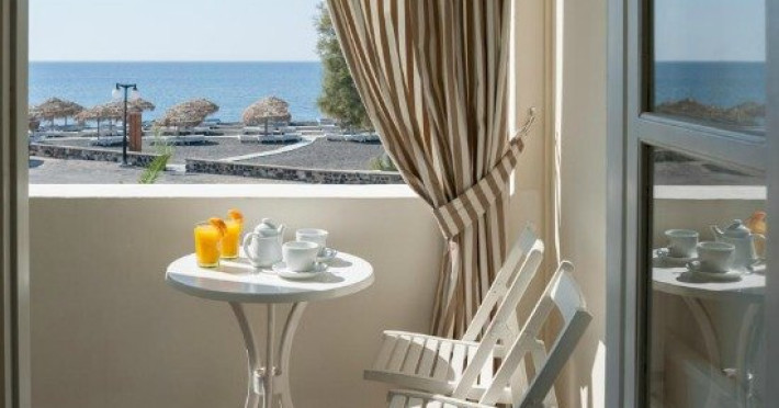 Hotelul este situat pe plaja de nisip vulcanic din micul sat pescaresc Perivolos, la 500 de metri de centrul statiunii Perissa si la 12 km de capitala insulei, Fira.