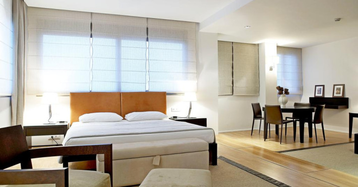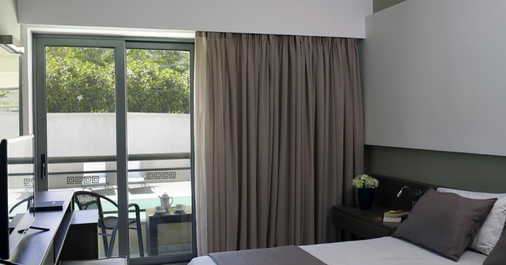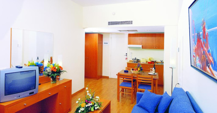Sunt disponibile 35 camere. Fiecare cameră dispune de mașină pentru preparare cafea sau ceai și fierbător În camere există baie cu cadă sau duș ce are în dotare foehn și articole de toaletă gratuite. Camerele luminoase de la Angela Suites & Lobby sunt dotate cu gresie sau parchet, aer condiționat, Tv și seif. Unele camere au balcon cu vedere la mare sau la piscină. Curățenia in cameră se face zilnic. Anumite camere au zonă de relaxare cu canapea și cadă cu hidromasaj care asigură un plus de confort și răsfăț. Fiecare unitate de cazare include o chicinetă utilată cu frigider, plită de gătit și ustensile de bucătărie. De asemenea, este disponibilă o zonă de luat masa. Proprietatea oferă camere pentru familie cu o suprafață mai mare și un număr mai mare de paturi față de cele standard. Se pot rezerva de asemenea camere pentru nefumători.