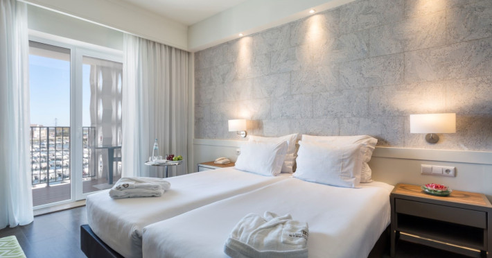 The accommodation at Eva Senses Hotel is characterized by a modern and elegant design, present in 136 rooms totally renovated and designed with total care to provide guests with maximum pleasure, comfort, and well-being during an unforgettable stay. The units are divided into 3 types, with 13 suites containing a complimentary welcome minibar and espresso machine, 52 superior rooms with two view options (marina/sea or city), 69 standard rooms with view to the city, plus 2 rooms for guests with reduced mobility. All accommodations are equipped with air conditioning/heating, cable LCD TV, telephone with direct exterior line, free safety deposit box, coffee and tea facilities, free high-speed Wi-Fi and bathroom with bathtub, shower, hairdryer, and other bath amenities.