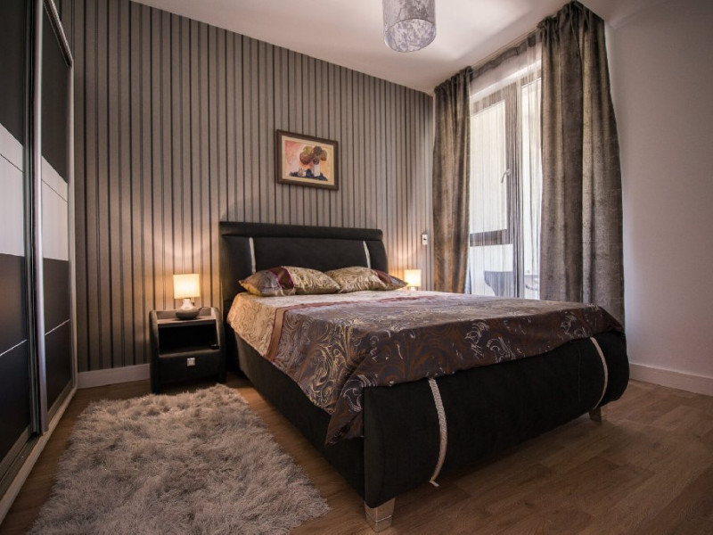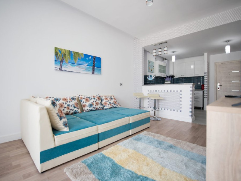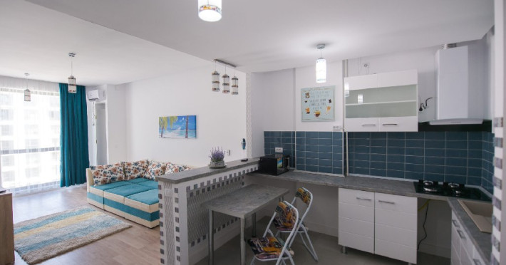 Apartamentul cu 2 camere ofera o vedere laterala la mare si se afla la doar 80 de metri distanta de plaja si promenada. Cu o suprafata de 64 mp, acesta are un dormitor si un living si poate gazdui confortabil 4 adulti si 1 copil. Beneficiaza de un balcon si un loc de parcare privat in blocul cu lift de pe strada D25 nr. 5, bl. B4, etajul 4.Apartamentul este situat in complexul rezidential Onix si este complet mobilat si utilat modern. Dispune de un living cu canapea extensibila, dormitor cu pat matrimonial, aer conditionat, 2 smart TV-uri, bucatarie complet utilata, baie cu cabina de dus si masina de spalat. Wi-Fi-ul gratuit este disponibil. De asemenea, terasa mobilata ofera o frumoasa panorama catre mare.