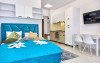 Studio Bora Bora cu o suprafata de 30 mp are in dotare 1 pat matrimonial si 1 pat de o persoana, bucatarie dotata cu plita de gatit , cuptor prajitor de paine, aparat de cafea, frigider , vesela, TV, wi-fi, aer conditionat, baie cu cabina de dus/cada, uscator de par, balcon cu vedere la mare.