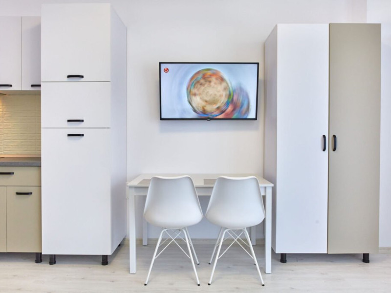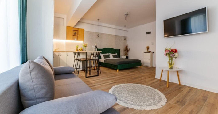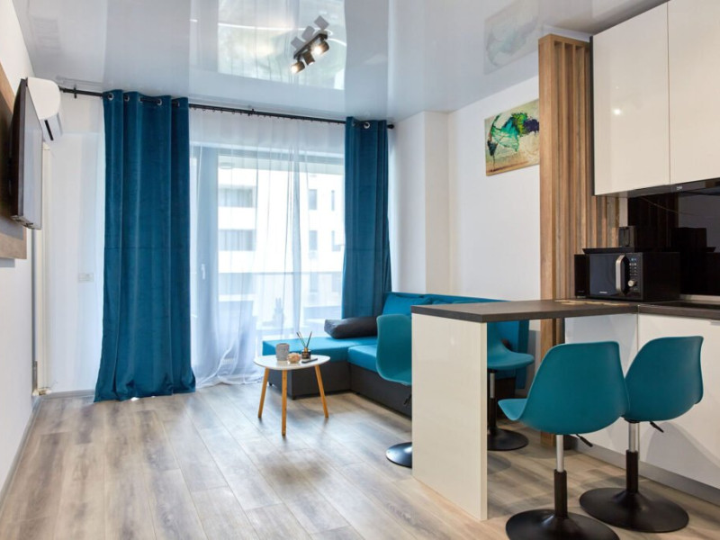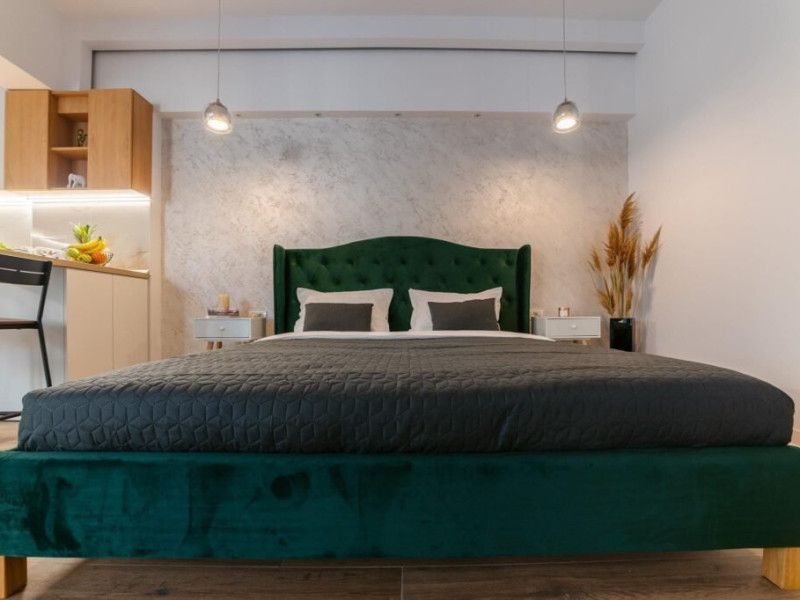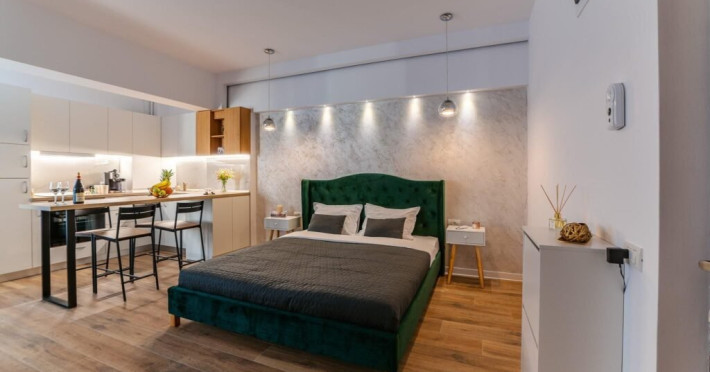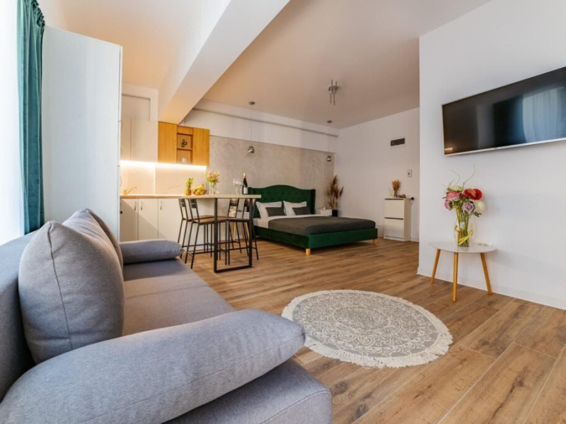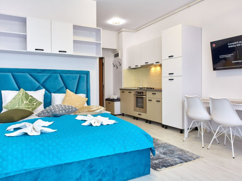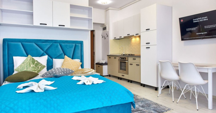 Studio Summer Time cu o suprafata de 62 mp este compus din living cu canapea extensibila, dormitor cu pat matrimonial, bucatarie dotata cu plita de gatit , cuptor prajitor de paine, aparat de cafea, frigider , vesela, TV, wi-fi, aer conditionat, baie cu cabina de dus, uscator de par, balcon cu mobilier.