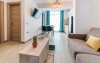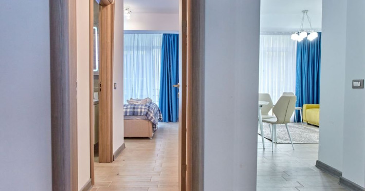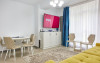 Apartament Sunny Holiday Alezzi - este format din living si dormitor. Livingul dispune de canapea extensibila, zona de luat masa, este open space cu bucataria completa utilata (aragaz, frigider, aparat de cafea, cuptor cu microunde), dormitorul este cu pat matrimonial. TV in ambele camere, wifi, aer conditionat, balcon. Suprafata 55 mp. Adresa strada Prelungirea D13 nr. 6, Bl G, parter.