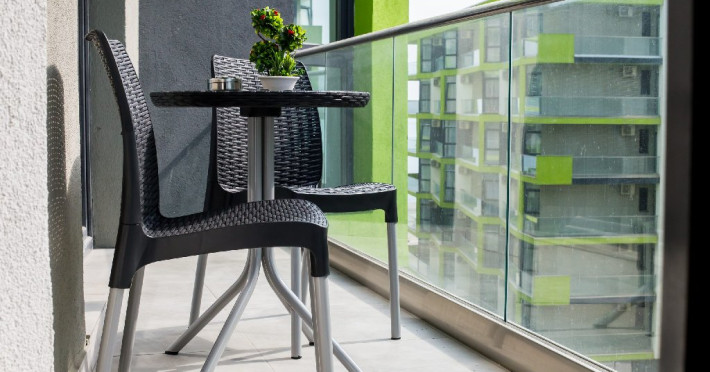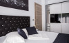 Fiind compus din doua camere, acces din fiecare pe terasa a cu vederea spre mare, apartamentul ofera capacitate de gazduire pentru 4 persoane, avand un pat matrimonial in dormitor si o canapea extensibila in living.