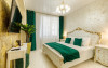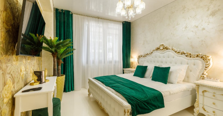 Dormitor King Size: Intra intr-un sanctuar de odihna cu dormitorul king size. Designul elegant si luxos, cu culori dominante alb, verde si auriu, creeaza un mediu relaxant si regal. Smart TV-ul si dulapul generos completeaza atmosfera plina de confort.
