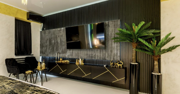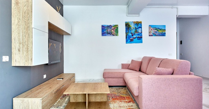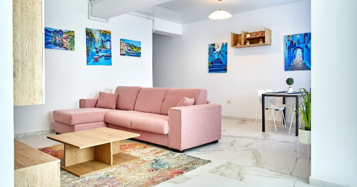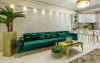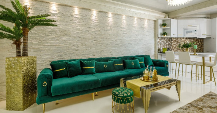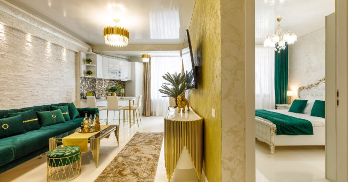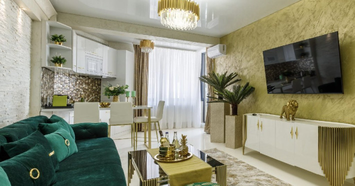 Sufragerie Open Space: Bucura-te de rafinament si confort intr-o sufragerie deschisa, aranjata cu atentie pentru a-ti oferi o experienta relaxanta de neegalat. Canapeaua extensibila verde, cu model auriu, adauga un strop de prospetime, in timp ce masa aurie si smart TV-ul mare redefinesc conceptul de relaxare.