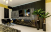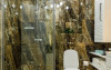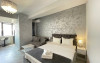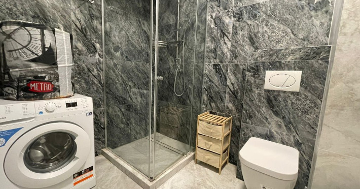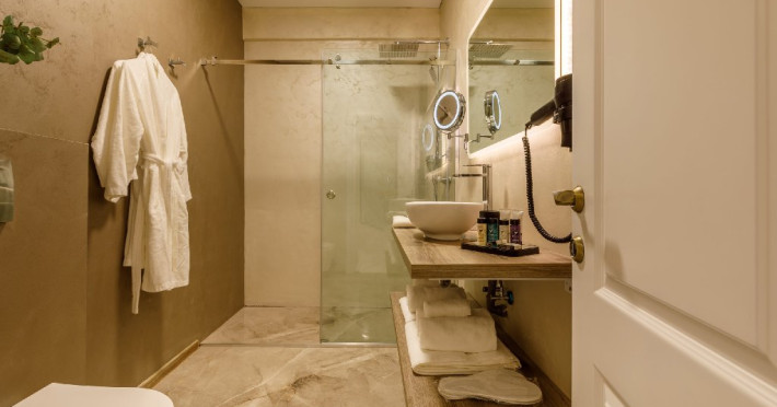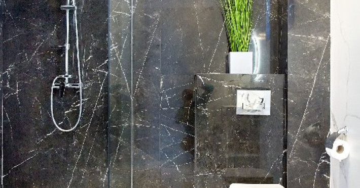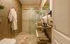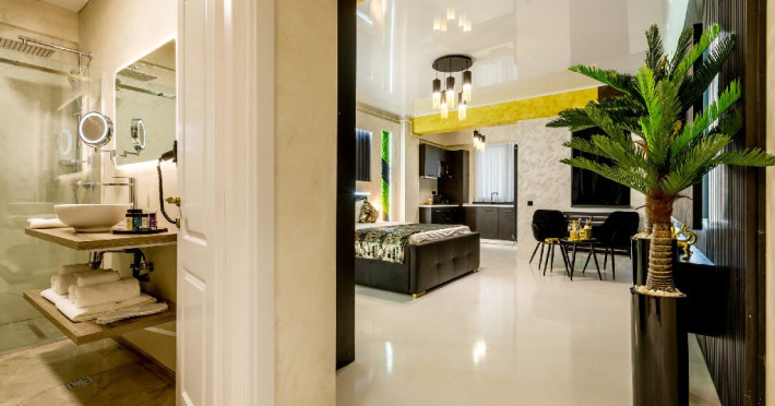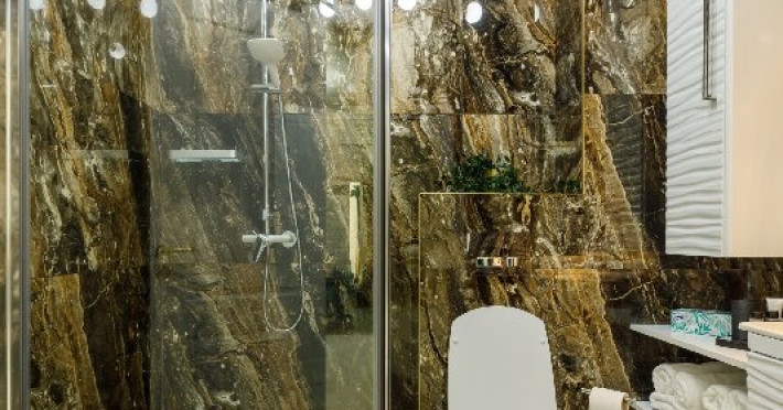 Baie in Marmura: Experimenteaza rafinamentul intr-o baie spatioasa, finisata cu marmura in nuante de negru si auriu. Dusul walk-in, uscatorul de par si dotarile premium te imbie la o experienta luxoasa.