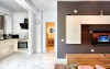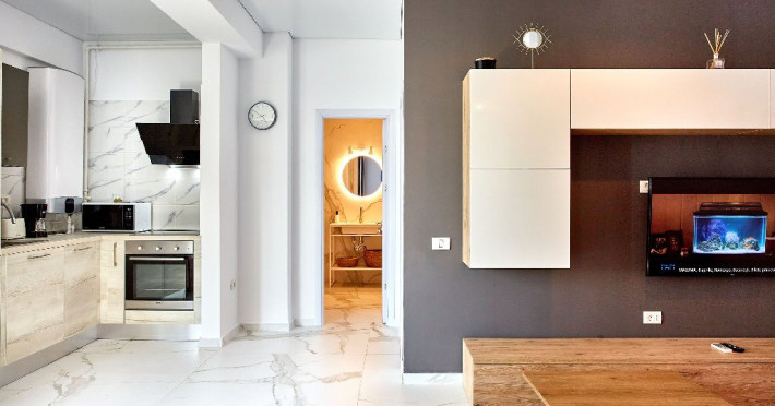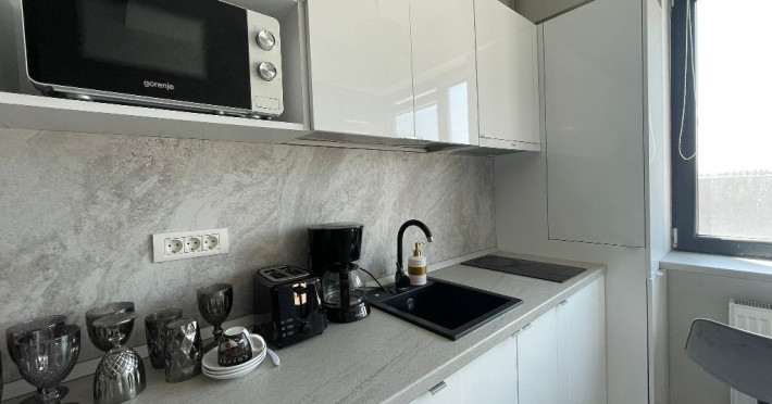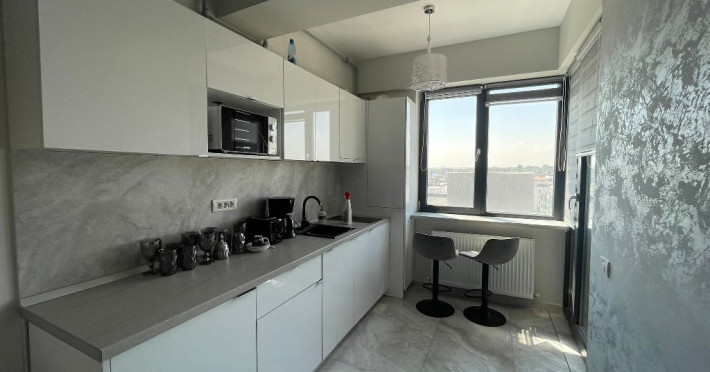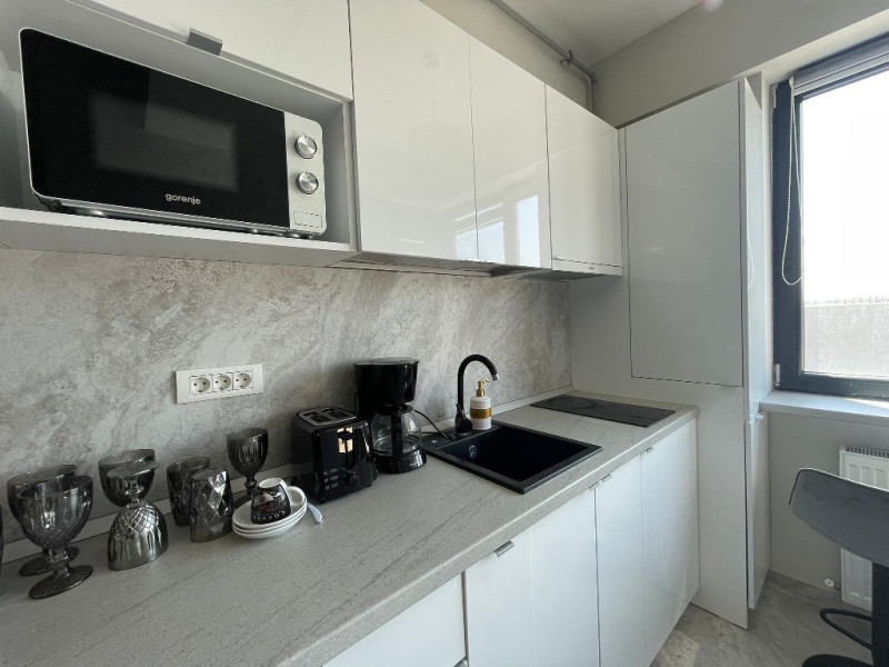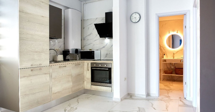 Bucatarie Refined: Cu o estetica eleganta si utilitate deplina, zona de bucatarie imbina stilul cu functionalitatea. Mobilierul alb de inalta calitate este echipat cu plita, cuptor cu microunde, fierbator si aparat de cafea. Masa prelungita si scaunele elegante creeaza un colt perfect pentru momentele de servire a mesei.