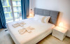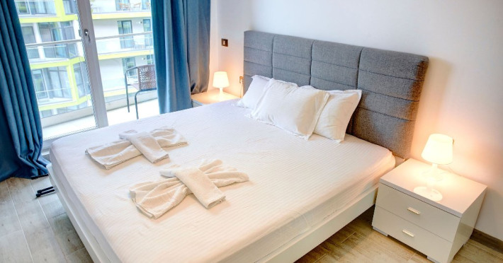 Fiind compus din doua camere, acces din fiecare pe terasa a cu vederea spre mare, apartamentul ofera capacitate de gazduire pentru 4 persoane, avand un pat matrimonial in dormitor si o canapea extensibila in living.