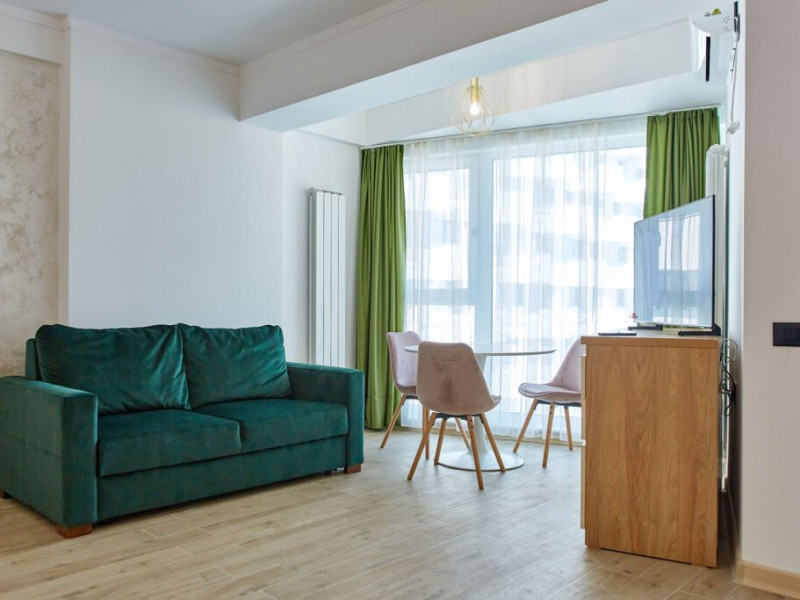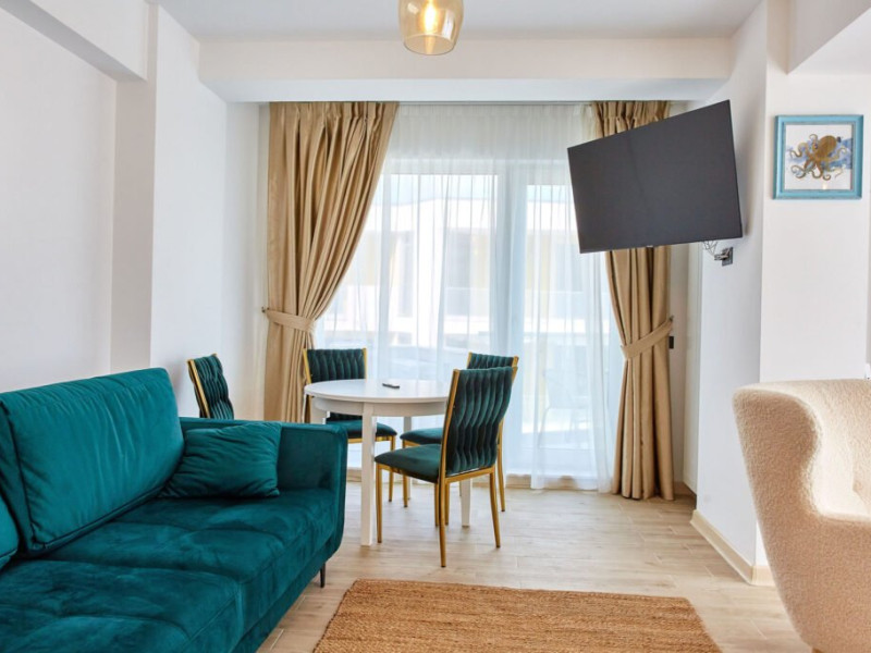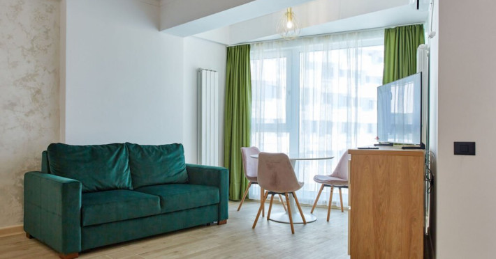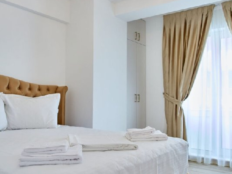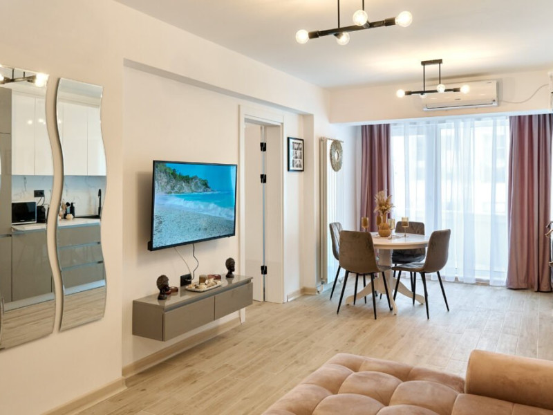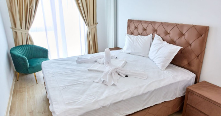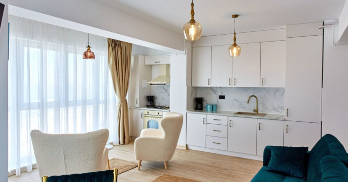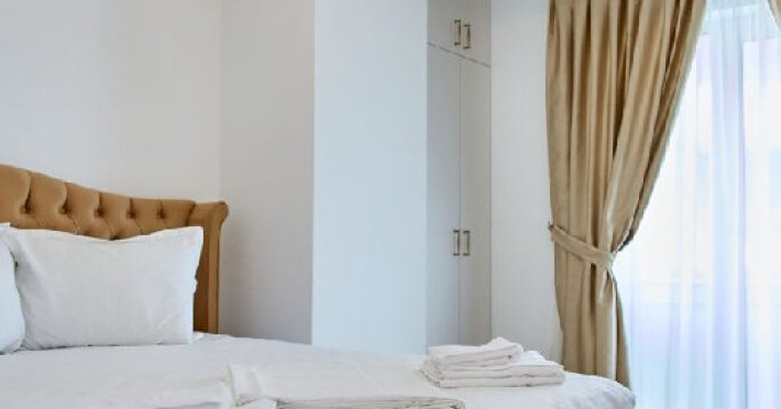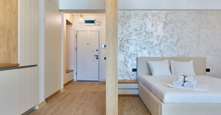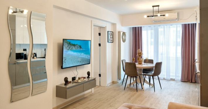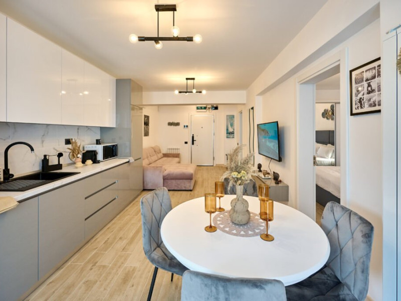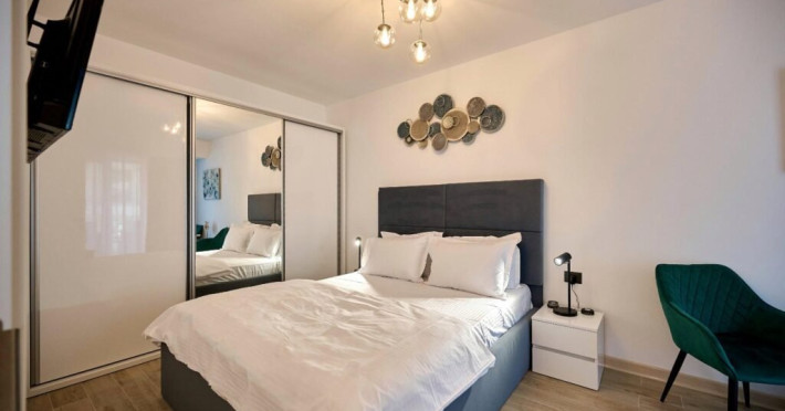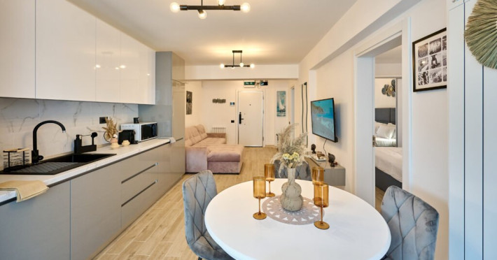 Apartamentul Cleo Infinity Alezzi cu o suprafata de 55 mp se compune din living cu canapea extensibila, bucatarie open space echipata cu plita, microunde, hota, aparat de cafea, frigider, dormitor cu pat matrimonial, wi fi, centrala proprie, aer conditionat in living si tv in ambele camere, baie cu dus walk in si masina de spalat si balcon. Adresa: strada Promenada nr. 85 bis, et. 5, complex Infinity Alezzi.