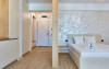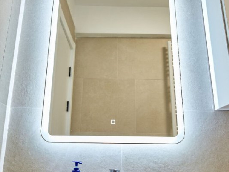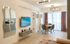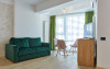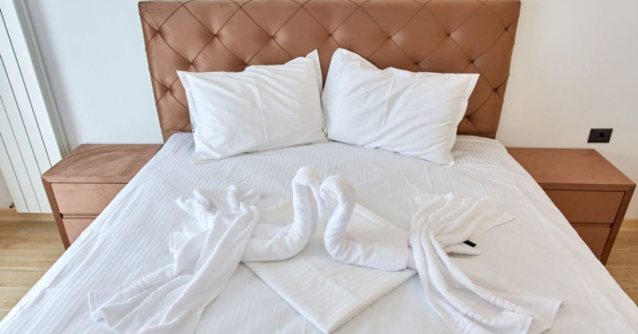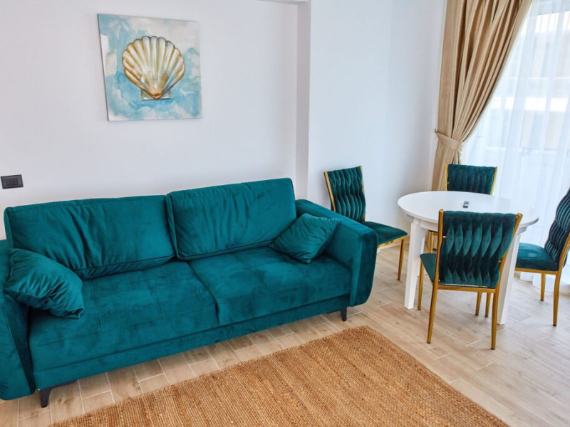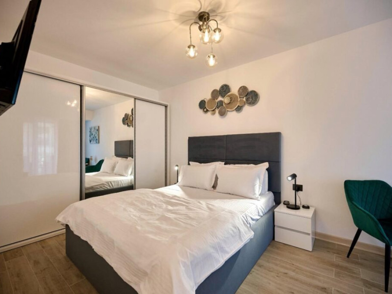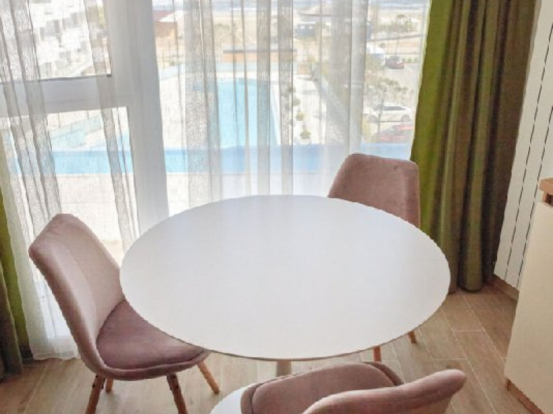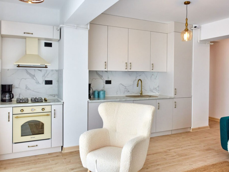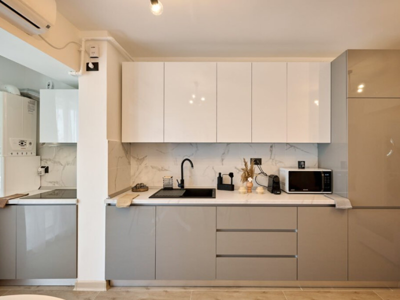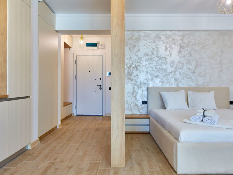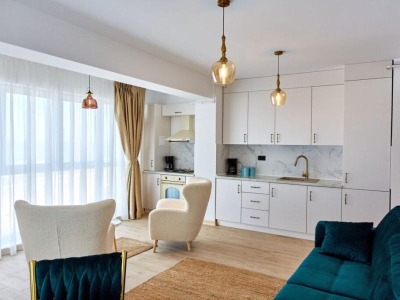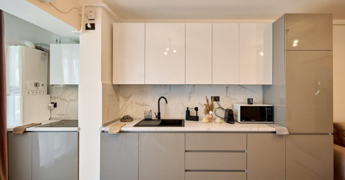 Apartamentul Cleo Infinity Alezzi cu o suprafata de 55 mp se compune din living cu canapea extensibila, bucatarie open space echipata cu plita, microunde, hota, aparat de cafea, frigider, dormitor cu pat matrimonial, wi fi, centrala proprie, aer conditionat in living si tv in ambele camere, baie cu dus walk in si masina de spalat si balcon. Adresa: strada Promenada nr. 85 bis, et. 5, complex Infinity Alezzi.