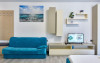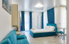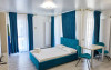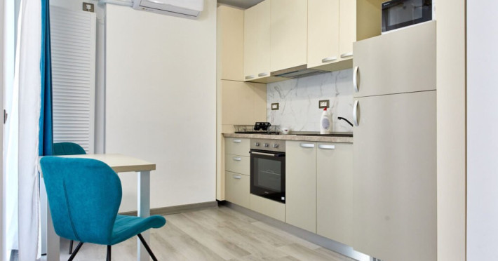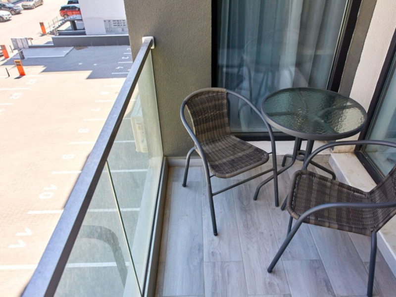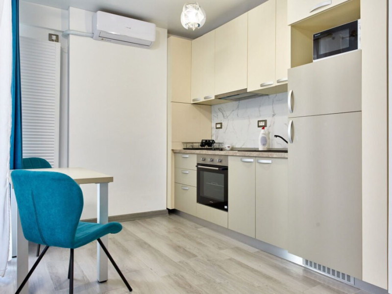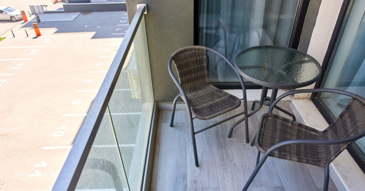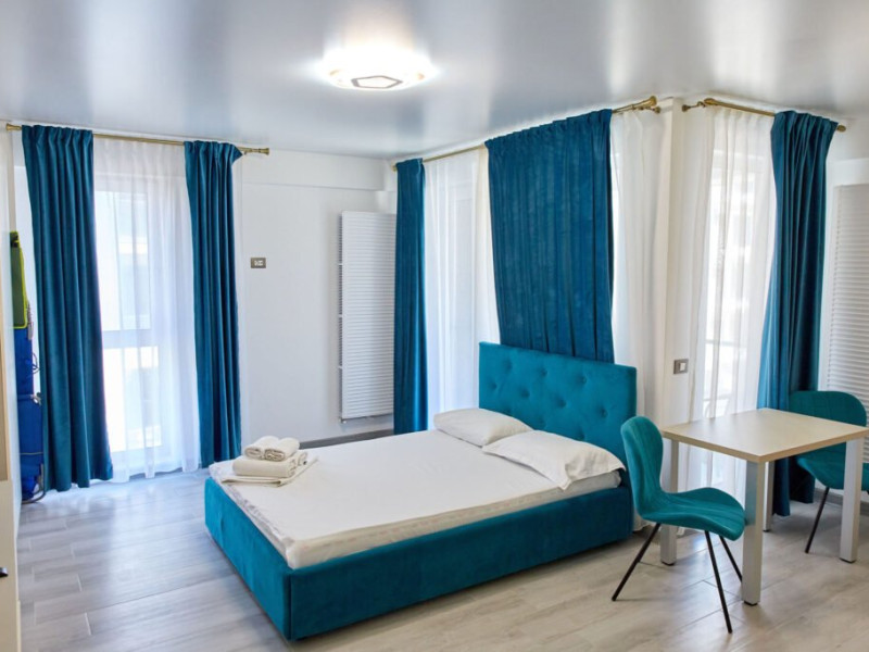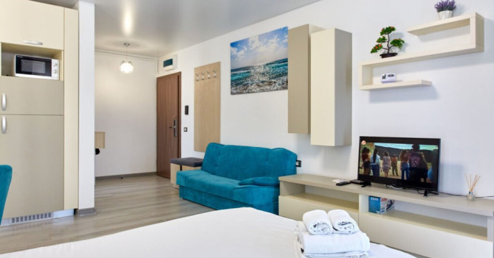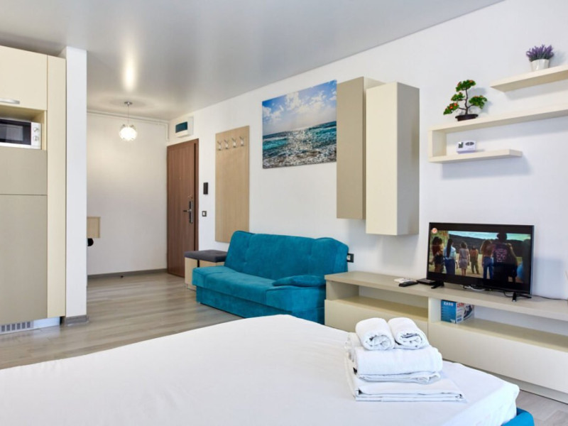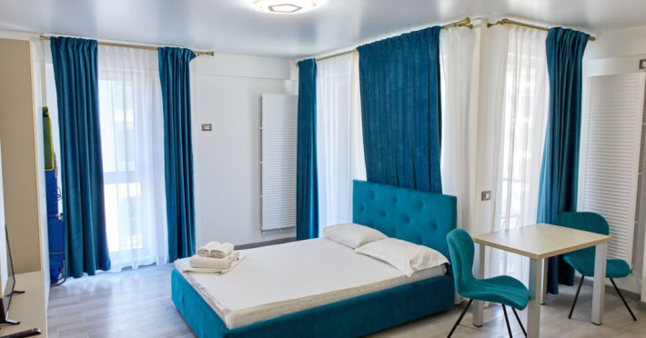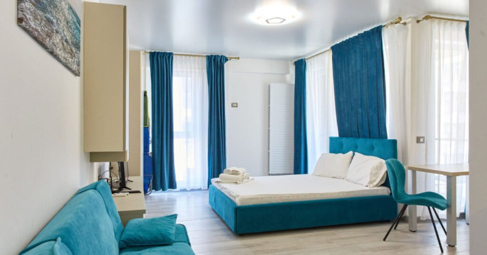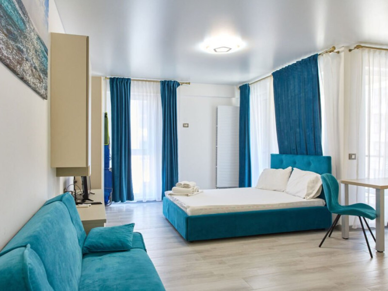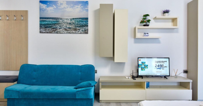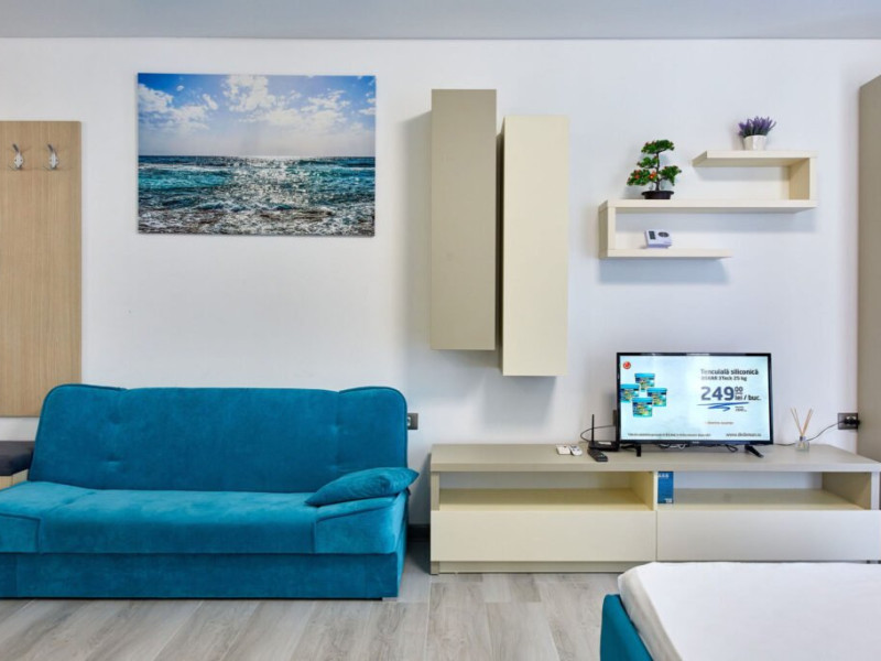 Studio Melody cu o suprafata de 35 mp este dotat cu pat matrimonial si canapea extensibila , bucatarie dotata cu plita moderna, cuptor cu microunde , frigider si vesela, baie cu cada, tv, aer conditionat, internet, centrala propie si balcon dotat cu mobilier.