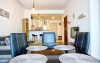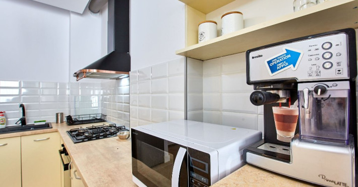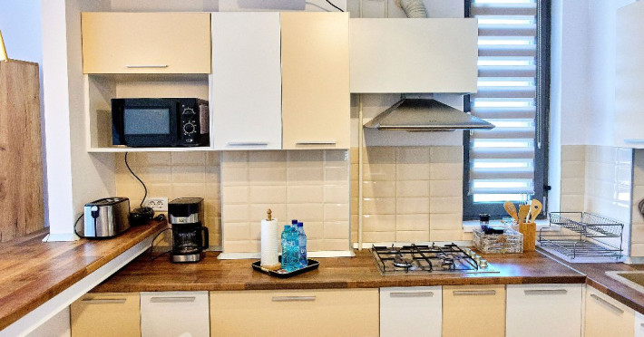 Bucataria Utilata Complet: Bucataria noastra complet utilata este un paradis pentru gurmanzi. Cu aragaz, hota, cuptor cu microunde, aparat de cafea, prajitor de paine si frigider, vei avea la dispozitie tot ce ai nevoie pentru a gati cele mai delicioase preparate. O masa de servit masa adauga un plus de confort si practicitate in zona de luat masa.