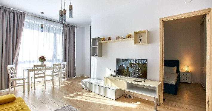 Living Open Space: Spatiul de zi deschis este ideal pentru momente de relaxare si socializare. Canapeaua extensibila are o capacitate de 2 persoane si este perfecta pentru momente de odihna sau pentru a gazdui oaspeti. Un al doilea televizor completeaza experienta de divertisment.