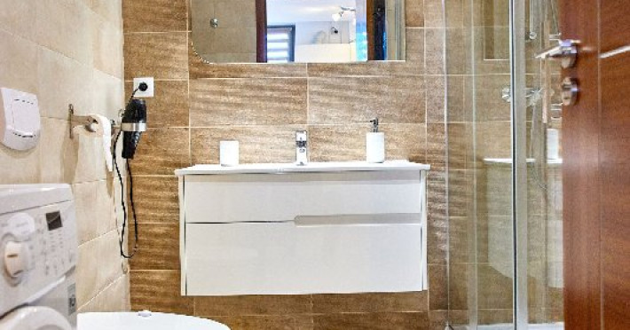 Baie Spatioasa si Functionala: Baia noastra este dotata cu tot ce este necesar pentru a-ti asigura confortul. Cu o cabina de dus si o masina de spalat, vei avea parte de tot confortul necesar pentru o experienta placuta.
