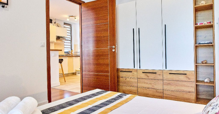 Dormitorul Modern si Confortabil: Te intampinam intr-o oaza de liniste si confort in dormitorul nostru modern. Culorile deschise si calde creeaza o atmosfera primitoare, iar patul matrimonial confortabil te asteapta pentru odihna si relaxare. Cu un dulap generos pentru a-ti organiza hainele si un TV amplasat strategic, vei avea parte de tot confortul necesar pentru un sejur perfect.