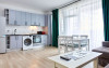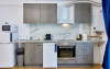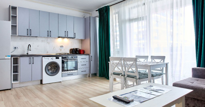 Bucatarie: Bucataria dispune de un mobilier in nuante de gri deschis, care se imbina perfect cu designul general al apartamentului. Fiecare detaliu este gandit pentru a maximiza spatiul si functionalitatea, de la sertarele spatioase la masina de spalat discret integrata in mobilier. Aceasta este dotata de asemenea cu un aragaz, cuptor, aparat de cafea, frigider, vesela.