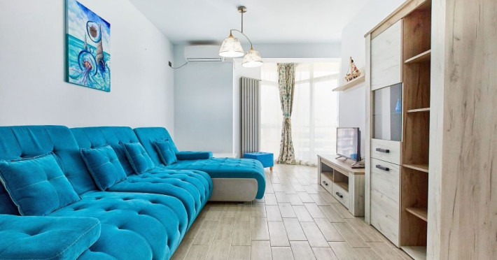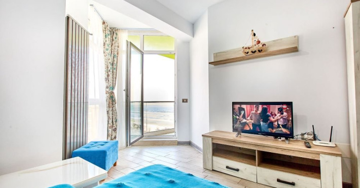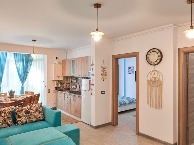 Apartament Complex Alezzi - este format din living si dormitor. Livingul dispune de canapea extensibila, zona de luat masa, open space cu bucataria completa utilata (aragaz, frigider, aparat de cafea, cuptor cu microunde), dormitorul este cu pat matrimonial. TV in ambele camere, wifi, aer conditionat, balcon mobilat, cu vedere la mare, baie cu cabina de dus si masina de spalat. Suprafata 64 mp. Adresa strada Prelungirea D13 nr. 6, Bl A, et. 6.