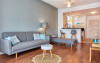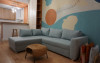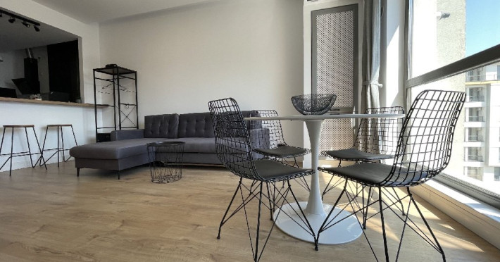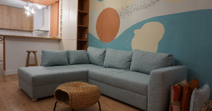 Sufrageria open-space: Sufrageria, cu un design modern, este punctul central al apartamentului. Canapeaua extensibila, in tonuri neutre, se potriveste perfect cu restul amenajarii. Sezlongul de catifea, asezat langa canapea, este locul ideal pentru momente de lectura sau relaxare. Zona de dining este practica si stilata, gata sa gazduiasca mese intime sau cu prietenii.