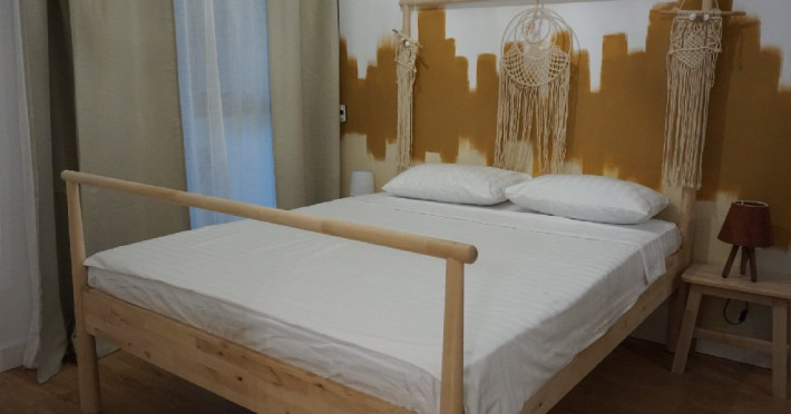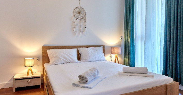 Apartamentul este foarte spatios, fiind amplasat intr-o cladire noua si beneficiaza de un interior placut si relaxant. Este alcatuit din 2 camere spatioase unde se pot caza 4 persoane deoarece este dotat cu pat matrimonial in dormitor si o canapea extensibila in living. Fiecare camera este dotata cu aer conditionat, smart TV si Wi-Fi de cea mai buna calitate. Bucataria este mobilata si utilata cu electronice si electrocasnice noi sporind astfel confortul casei cat si ale turistilor. Terasa este accesibila din living, fiind mobilata unde puteti savura cafeaua si unde puteti admira privelistea asupra marii.