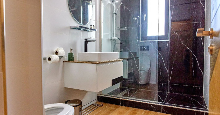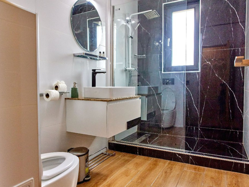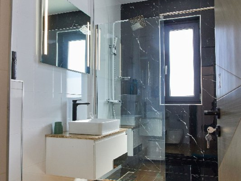 Reluati-va energiile intr-o baie spatioasa si moderna, dotata cu un dus walk-in elegant si toate facilitatile necesare pentru confortul dumneavoastra.