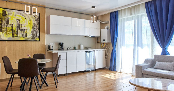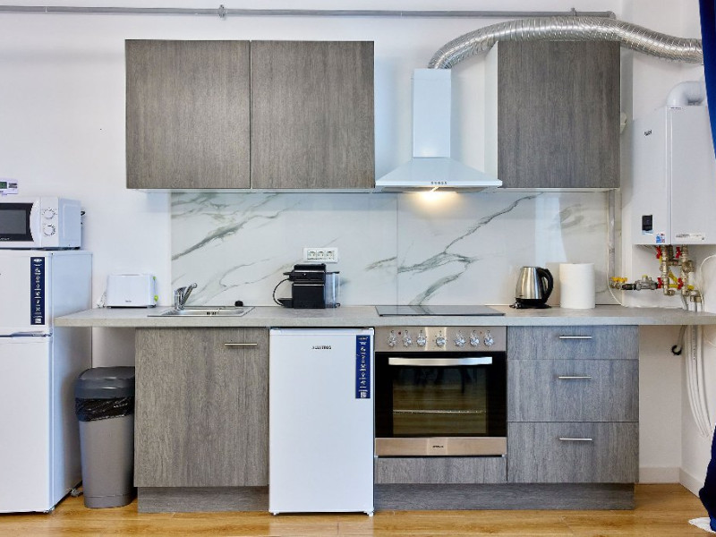 Gatiti cu usurinta intr-o bucatarie complet utilata, echipata cu plita, hota, aparat de cafea, fierbator si frigider, pentru a prepara cele mai delicioase mAencaruri.