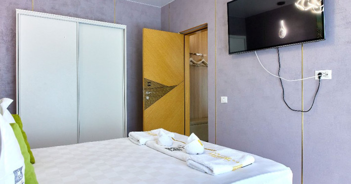 Bucurati-va de odihna deplina intr-un pat matrimonial extrem de confortabil, echipat cu lenjerii moi si perne pufoase pentru un somn linistit si odihnitor.