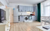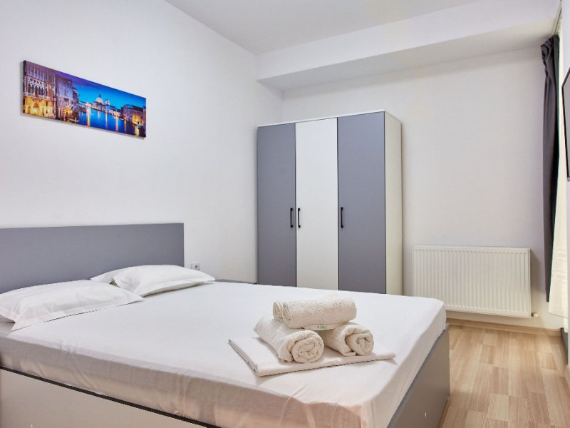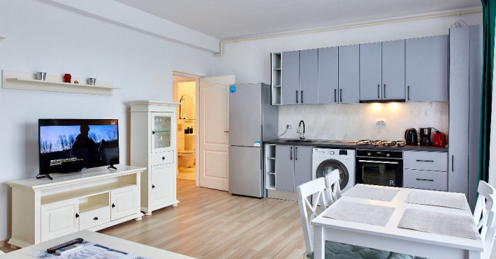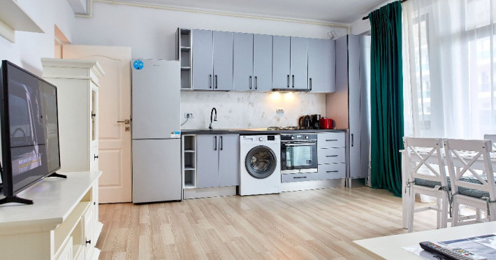 Bucatarie: Bucataria dispune de un mobilier in nuante de gri deschis, care se imbina perfect cu designul general al apartamentului. Fiecare detaliu este gandit pentru a maximiza spatiul si functionalitatea, de la sertarele spatioase la masina de spalat discret integrata in mobilier. Aceasta este dotata de asemenea cu un aragaz, cuptor, aparat de cafea, frigider, vesela.