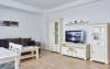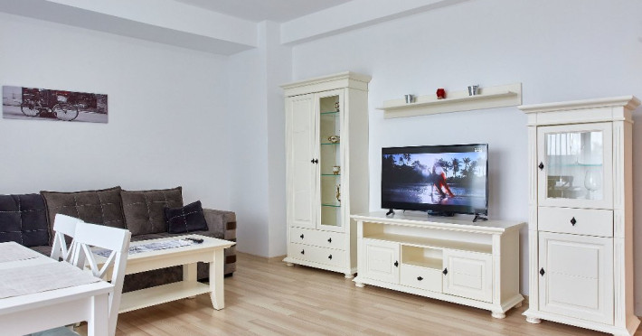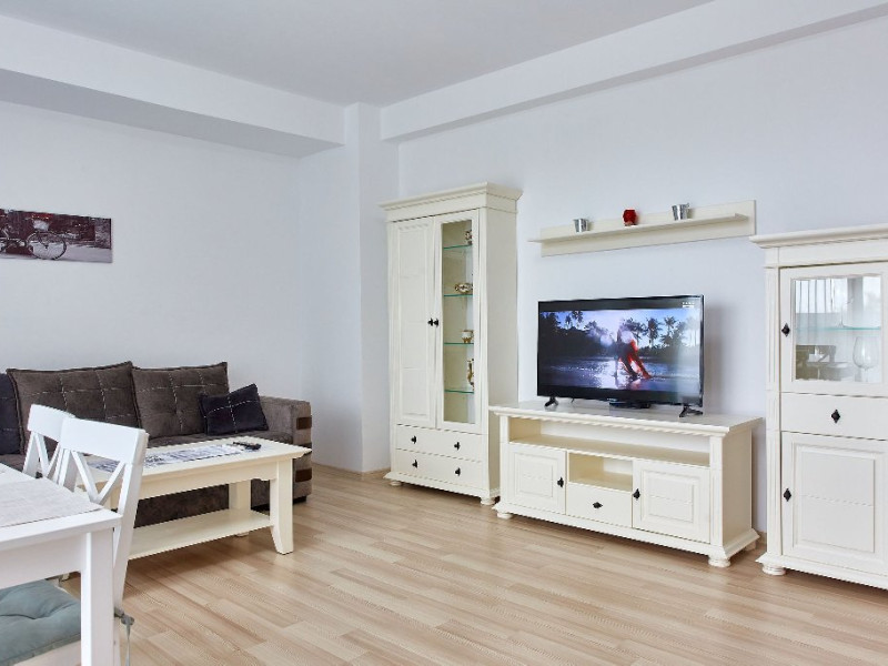 Sufragerie open space: La intrarea in apartamentul Solis Residence, esti intampinat de o sufragerie open space, unde predomina tonurile neutre si liniile curate. Canapeaua extensibila, intr-o nuanta inchisa, promite momente de relaxare, in timp ce vizionarea programelor preferate pe televizorul plasat in fata acesteia devine o activitate de zi cu zi. In apropierea canapelei, o masa eleganta insotita de scaune albe iti ofera spatiul ideal pentru a savura mesele. Televizorul este amplasat pe un mobilier alb, cu multiple spatii de depozitare, care adauga functionalitate si stil sufrageriei.