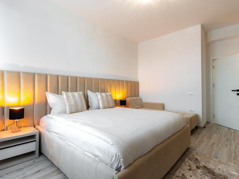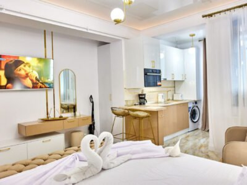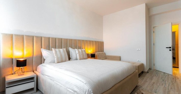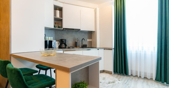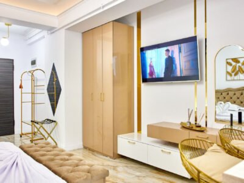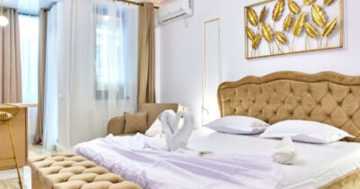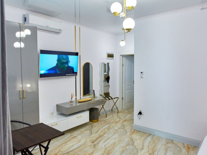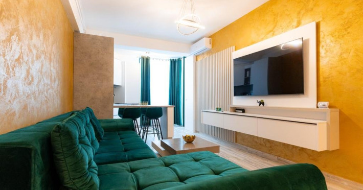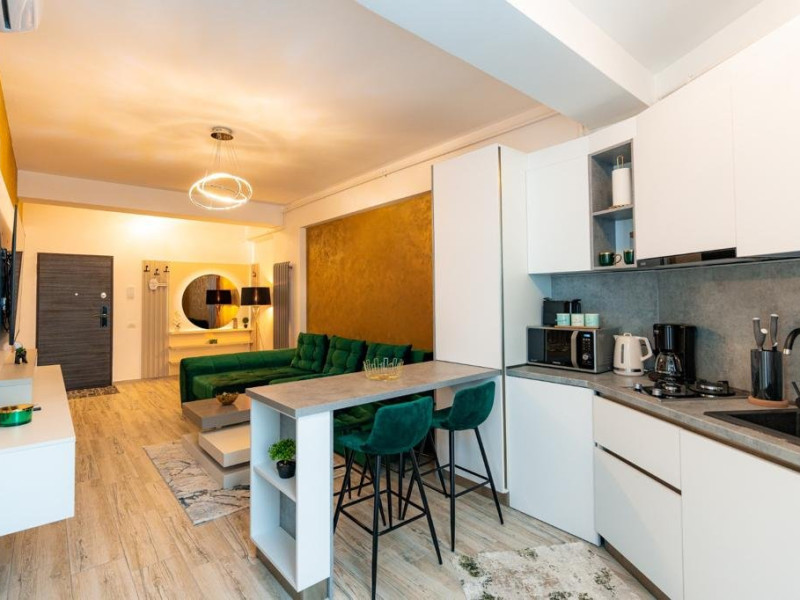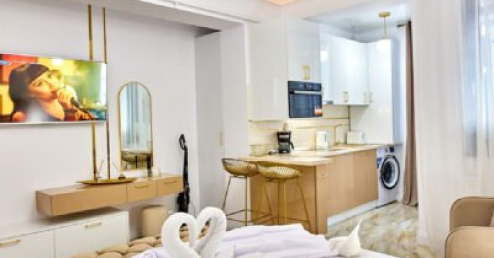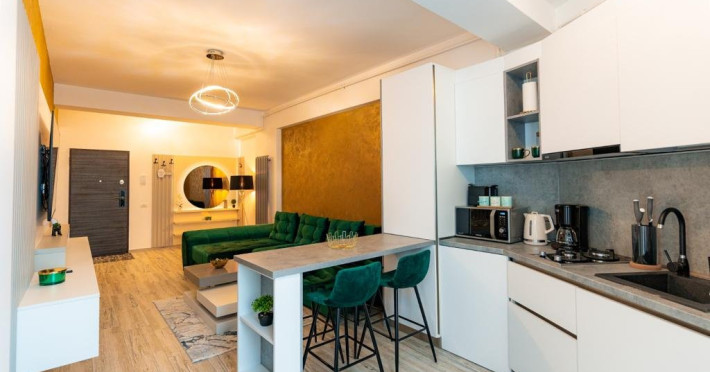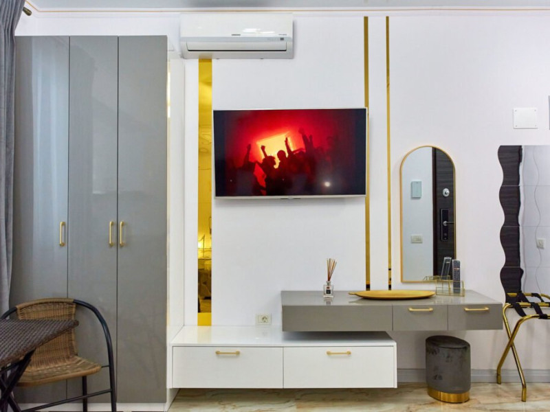 Apartament Gold House Stefan Resort are un dormitor cu pat matrimonial, living open space cu bucataria care este complet echipata cu aragaz modern, cuptor cu microunde, frigider, baia dotata cu cabina de dus, balcon spatios cu vedere laterala la mare, tv, wifi, aer conditionat.