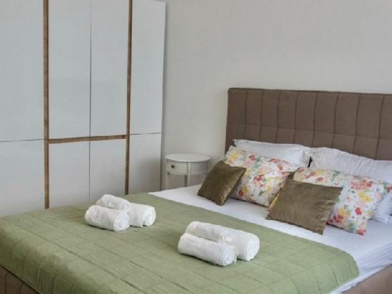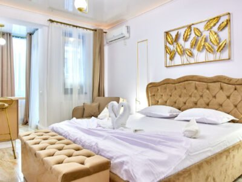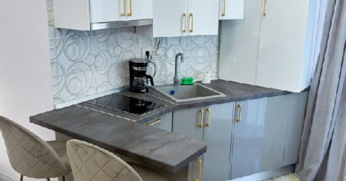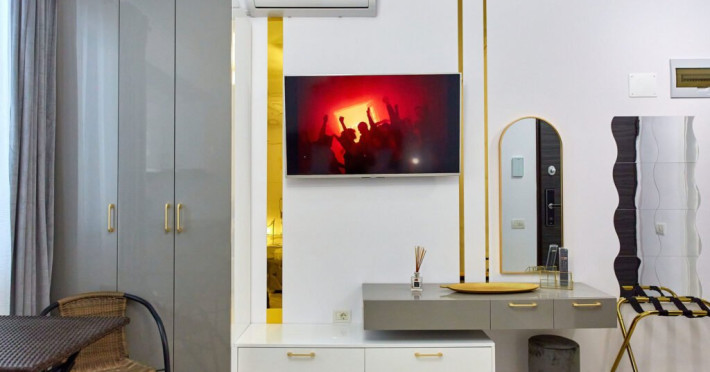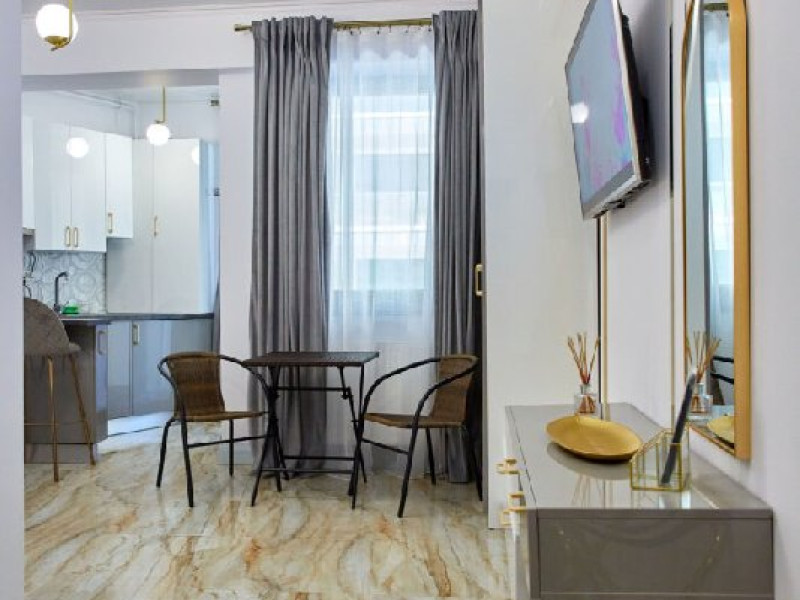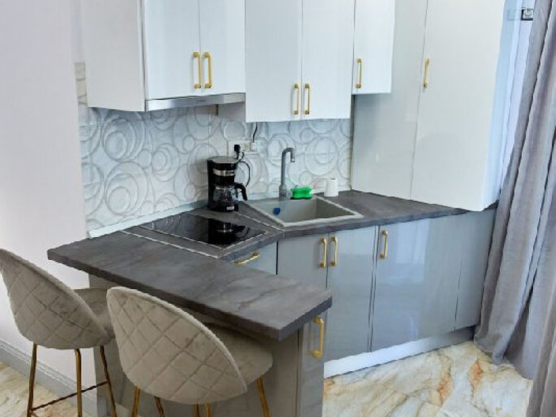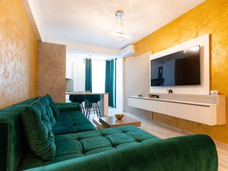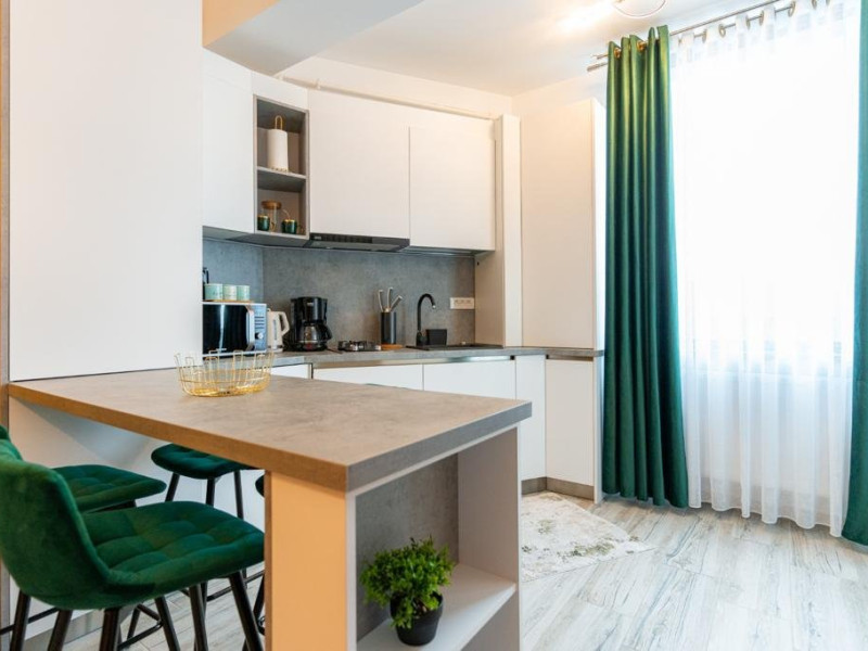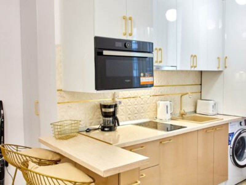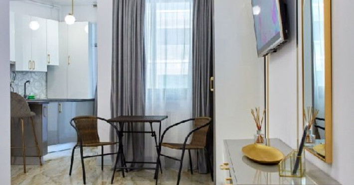 Apartament Gold House Stefan Resort are un dormitor cu pat matrimonial, living open space cu bucataria care este complet echipata cu aragaz modern, cuptor cu microunde, frigider, baia dotata cu cabina de dus, balcon spatios cu vedere laterala la mare, tv, wifi, aer conditionat.