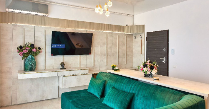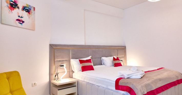 Apartamentul ofera 2 camere spatioase dotate cu SmartTv uri, electronice si electrocasnice de inalta calitate pentru prepararea meselor delicioase, a cafelei si a ceaiului, acestea fiind situate in bucatarie. Pe langa acestea, in locatie va fi si un pat matrimonial, o canapea extensibila disponibila pentru 2 persoane, un living, dressing generos si o baie, toate acestea fiind amenajate cu mare atentie si in cele mai mici detalii pentru a va oferi o sedere cat mai plaacuta.