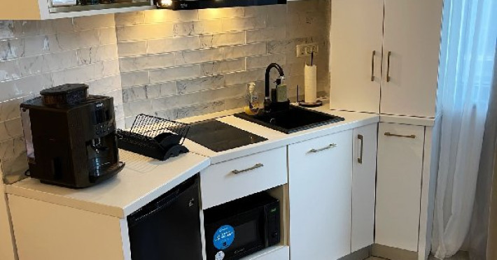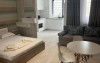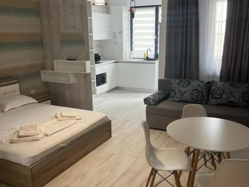 Studio-ul are o capacitate de cazare de 3 adulti si 1 copil, fiind amenajat modern si confortabil. Dispune de un pat matrimonial elegant si o canapea extensibila, creand un ambient placut si relaxant.