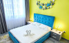 Un dormitor primitor cu un pat matrimonial in nuante de galben, oferind un somn odihnitor si reconfortant.