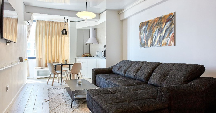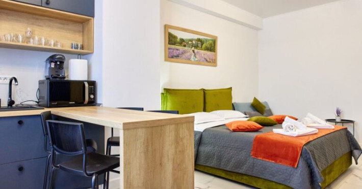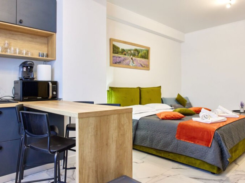 Confort si eleganta in dormitor: Studio-ul va intampina cu un pat matrimonial confortabil, in fata caruia se afla un televizor smart pentru seri relaxante de divertisment. Langa pat, un fotoliu extensibil adauga flexibilitate si confort, permitand cazarea a pana la 3 persoane.