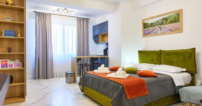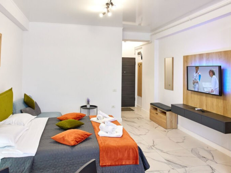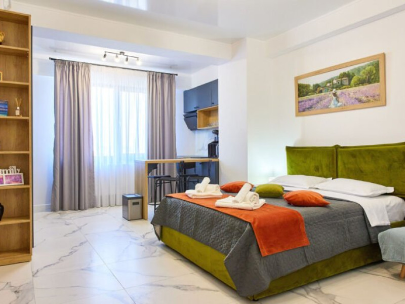 Studio-ul va pune la dispozitie pat matrimonial, dressing, TV cu o gama larga de posturi, Wi-Fi de cea mai buna calitate si aer conditionat, punand astfel pe primul loc confortul oferit clientilor.