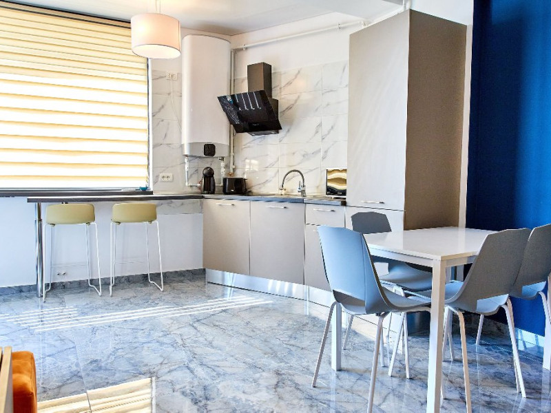 Bucataria este mobilata si utilata modern cu electronice si electrocasnice noi, astfel incat nu veti duce lipsa de absolut nimic.